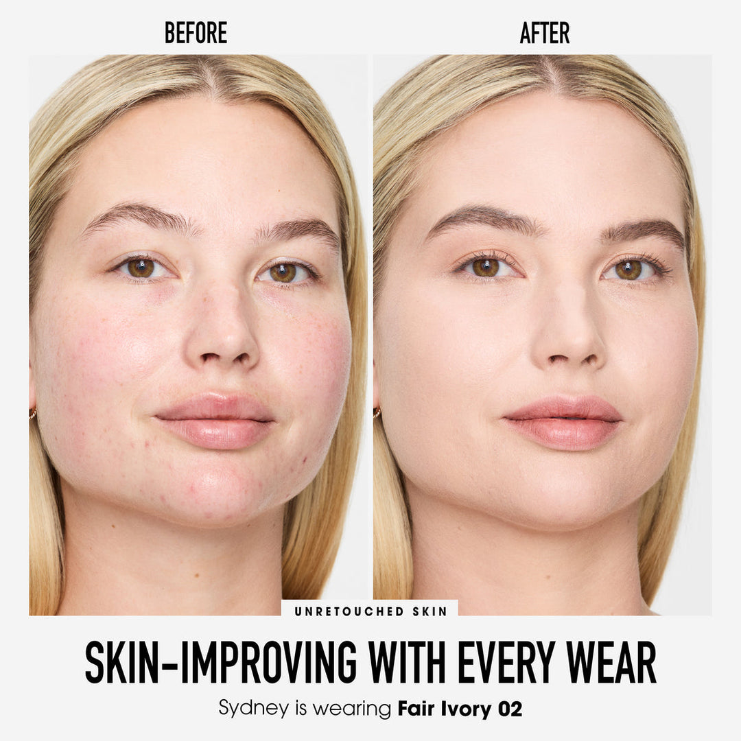 Khi phủ lên da, màu Fair Ivory 02 gần như hòa quyện hoàn hảo, mang lại hiệu ứng “my skin but better”. Lớp nền mỏng nhẹ, dễ dàng điều chỉnh từ che phủ mỏng nhẹ (sheer) đến che phủ cao (full coverage) mà không làm mất đi vẻ tự nhiên.