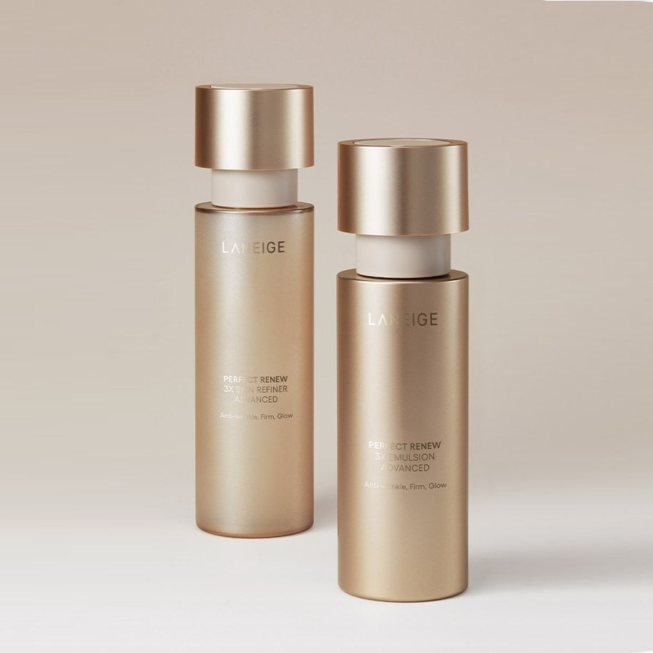 Bộ sản phẩm LANEIGE Perfect Renew 3X Advanced 2 Step Set là giải pháp chống lão hóa chuyên sâu từ thương hiệu mỹ phẩm Hàn Quốc danh tiếng Laneige, gồm 4 sản phẩm: Skin Refiner Advanced (150ml), Emulsion Advanced (130ml), Cream Advanced (8ml), và Signature Serum Advanced (2ml x 3ea). Bộ sản phẩm này hứa hẹn mang đến hiệu quả toàn diện trong việc phục hồi, cải thiện kết cấu da và tăng cường độ ẩm, độ đàn hồi, giúp làn da khỏe mạnh, sáng mịn và trẻ trung rõ rệt chỉ sau vài tuần sử dụng.