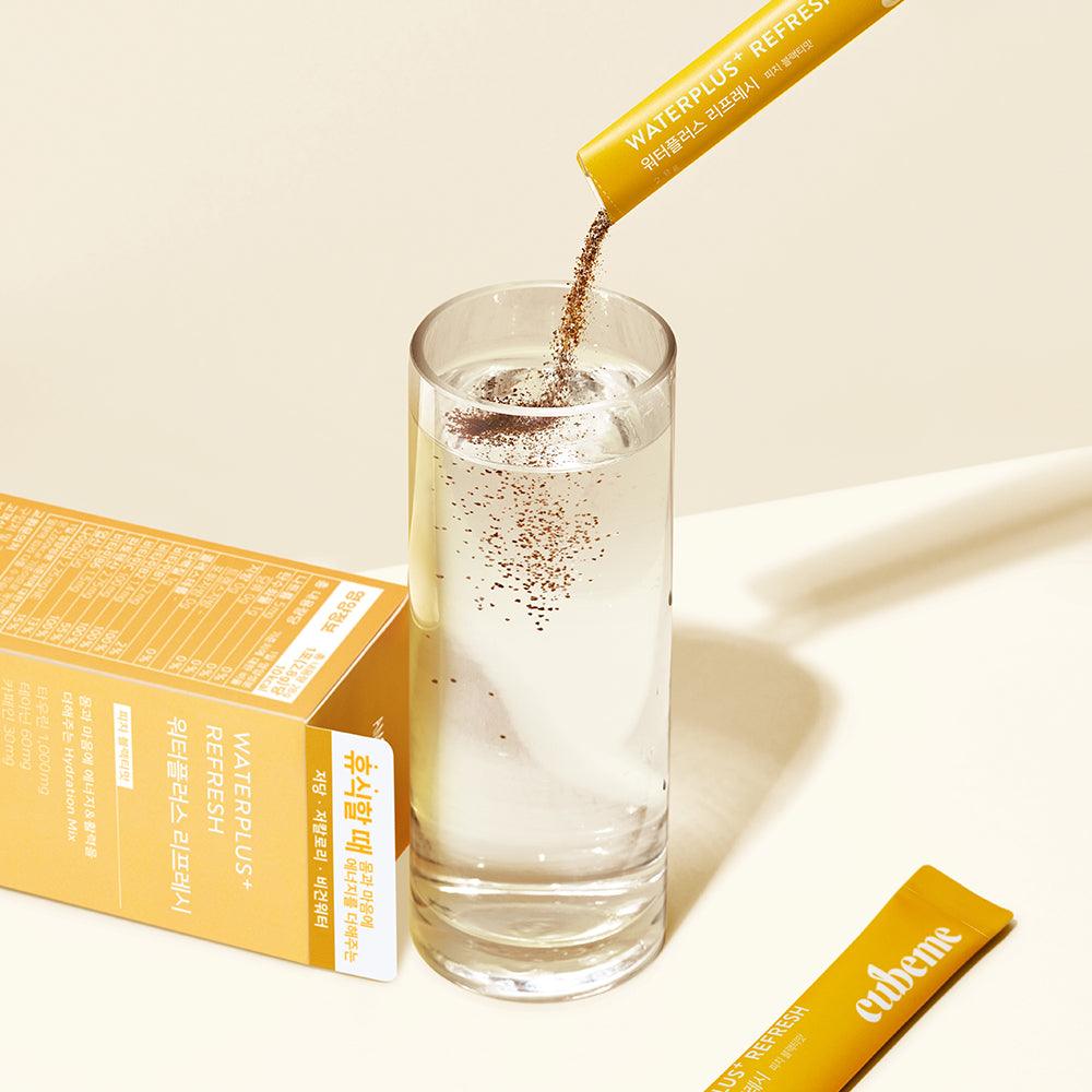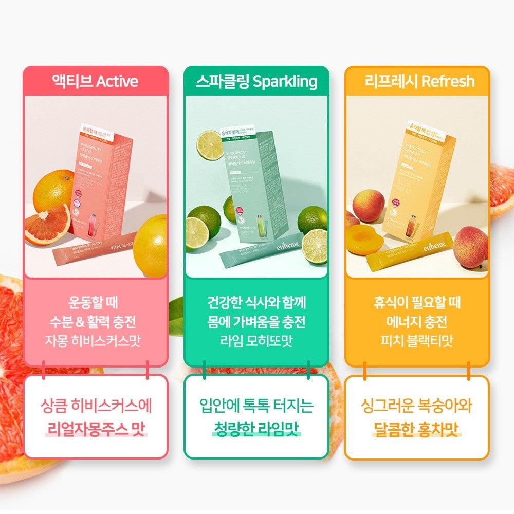 Vital Beautie Water Plus Refresh: Trà đen vị đào tươi nạp năng lượng khi cần nghỉ ngơi. Chứa 7 loại vitamin, theanine và caffein, taurine và polyphenol.