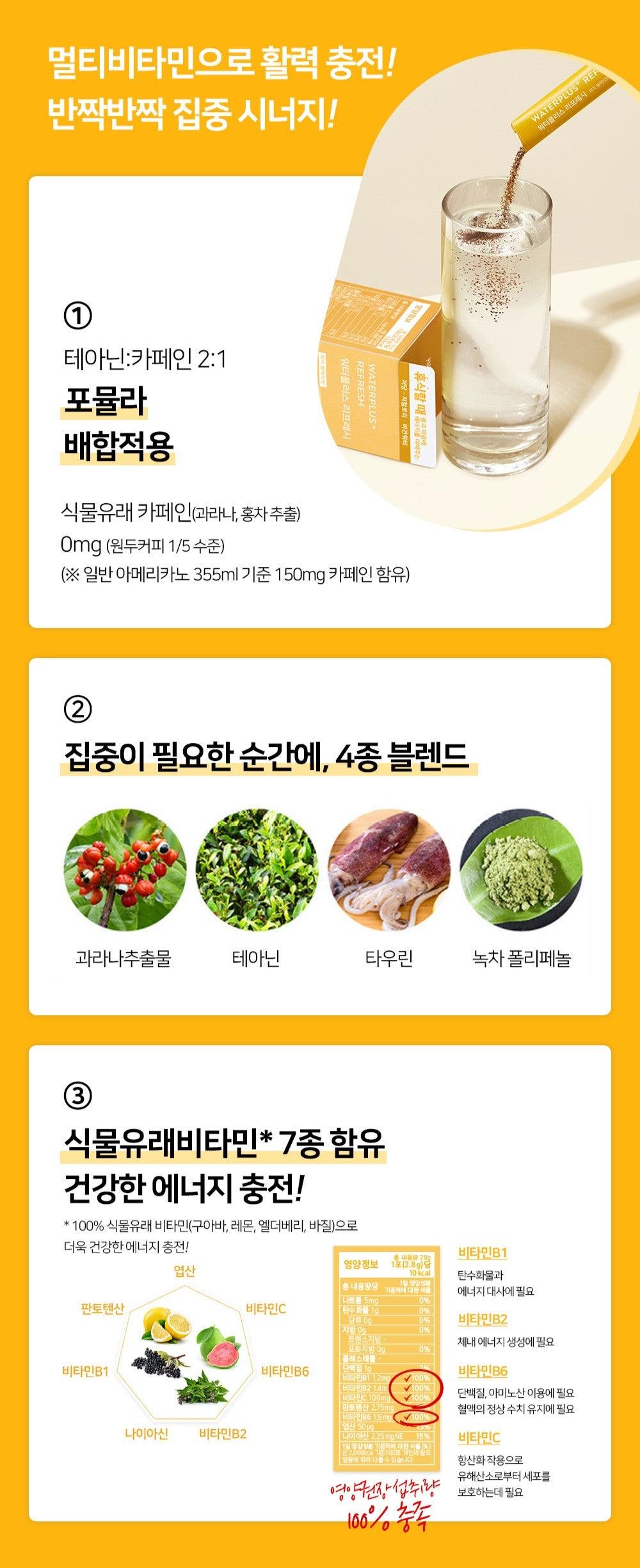 Khi cần tập trung, pha trộn 4 loại từ chiết xuất guarana, theanine, taurin từ mực và polyphenol trà xanh. Nạp lại năng lượng lành mạnh với 7 loại vitamin gồm vitamin C, vitamin B2, vitamin B1, vitamin B6, Niacin, axit pantothenic, axit folic có nguồn gốc thực vật (ổi, chanh, elderberry, húng quế).