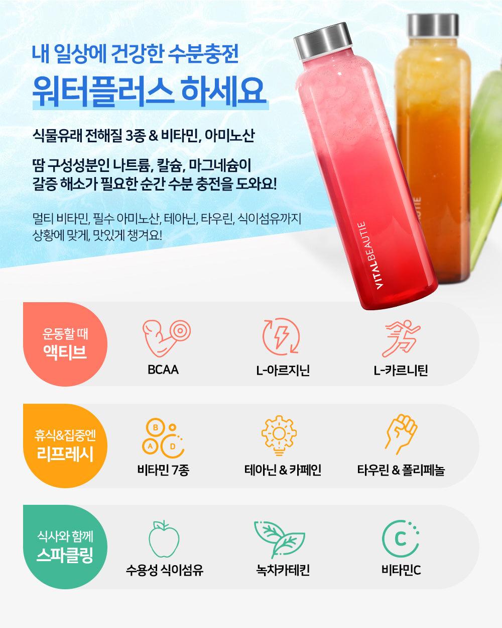 Sử dụng Nước Điện Giải Vital Beautie Water Plus để bổ sung độ ẩm lành mạnh trong cuộc sống hàng ngày của bạn 3 chất điện giải và vitamin, axit amin có nguồn gốc từ thực vật Natri, canxi và magiê, các thành phần của mồ hôi, giúp bổ sung độ ẩm ngay khi bạn cần giải tỏa cơn khát.