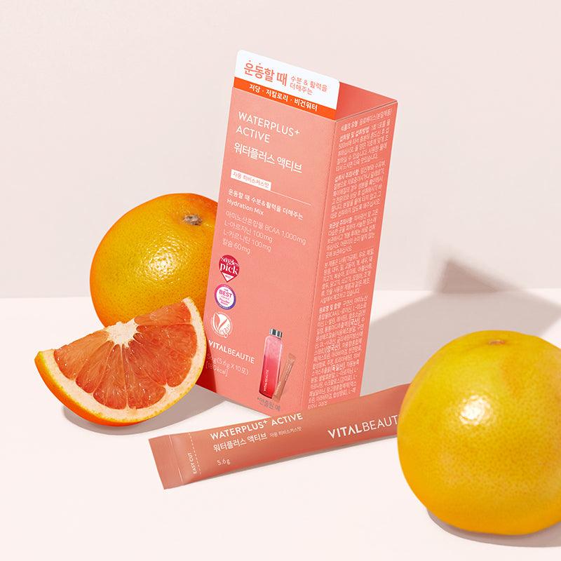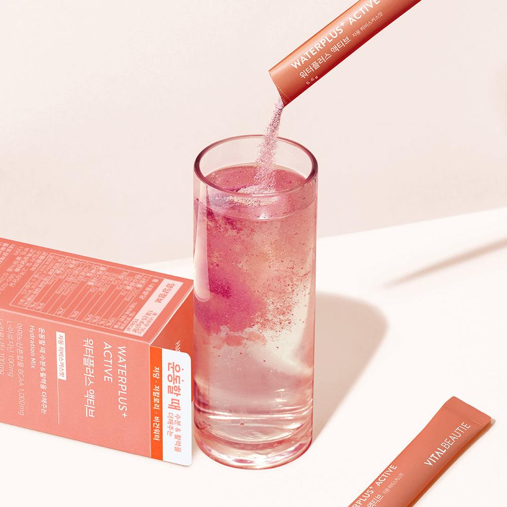 Vital Beautie Water Plus Active: Dưỡng ẩm và phục hồi sức sống khi tập thể dục leo núi, chạy bộ, Pilates, chứa BCAA, L- Arginine, L- Carnitine mang vị hibiscus tươi và hương vị nước ép bưởi thật.