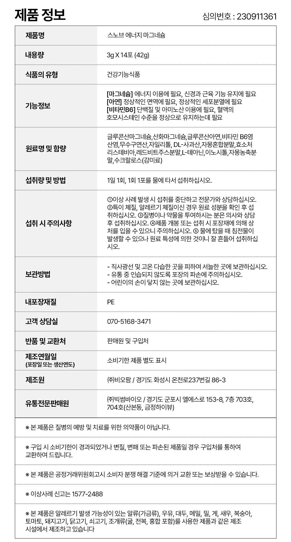 Mỗi hộp About H Snovv Energy Magnesium gồm 14 gói bột (3g/gói), tương ứng với liệu trình 2 tuần sử dụng. Sản phẩm thuộc nhóm thực phẩm bảo vệ sức khỏe (건강기능식품), được thiết kế ở dạng bột hòa tan hoặc có thể uống trực tiếp, rất tiện cho người thường xuyên di chuyển.