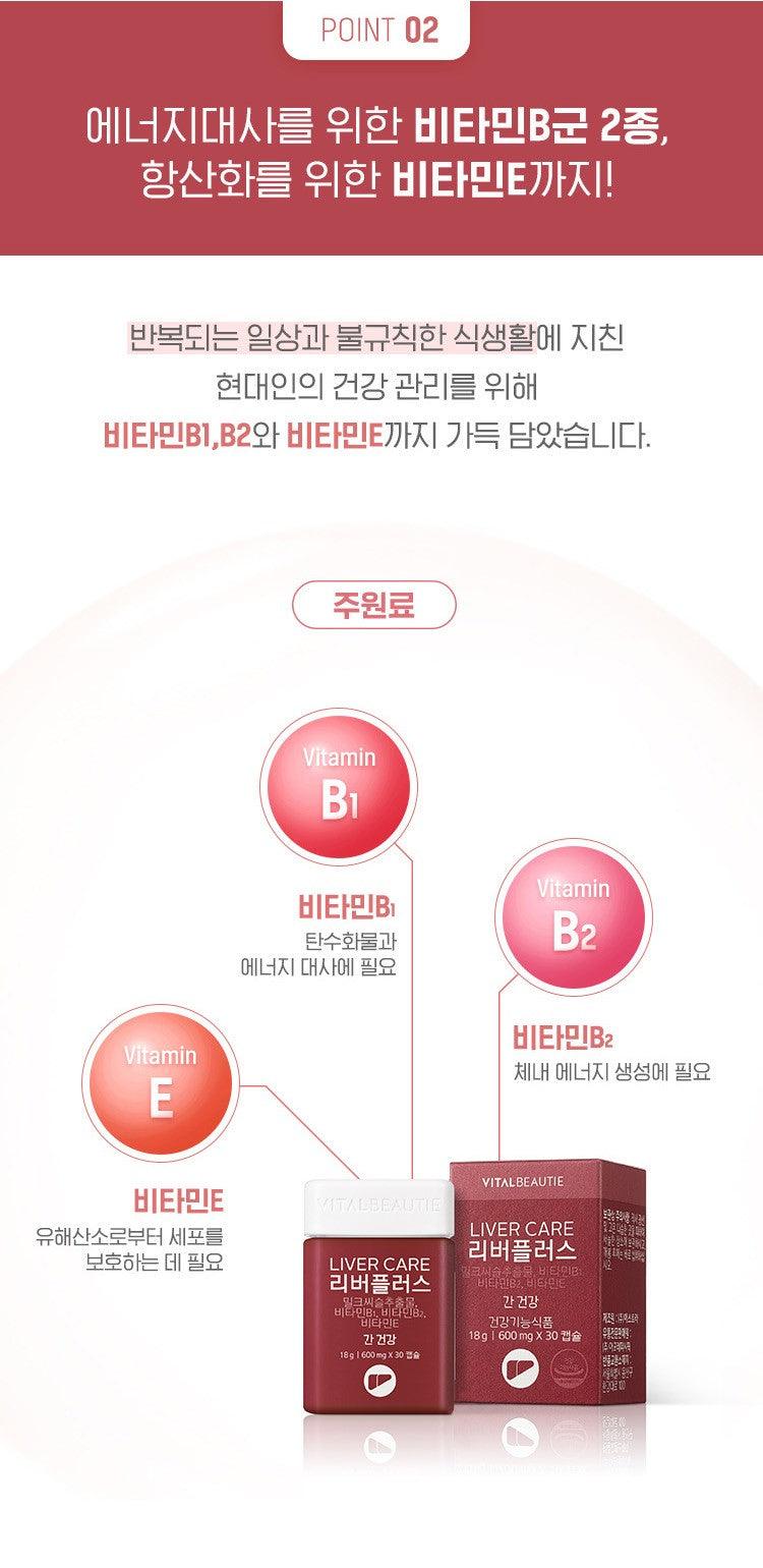 Viên Bổ Gan Vital Beautie Liver Plus chứa đầy đủ vitamin B1, B2 và vitamin E để chăm sóc sức khỏe cho những người hiện đại, những người mệt mỏi với cuộc sống hàng ngày lặp đi lặp lại và thói quen ăn uống không điều độ.