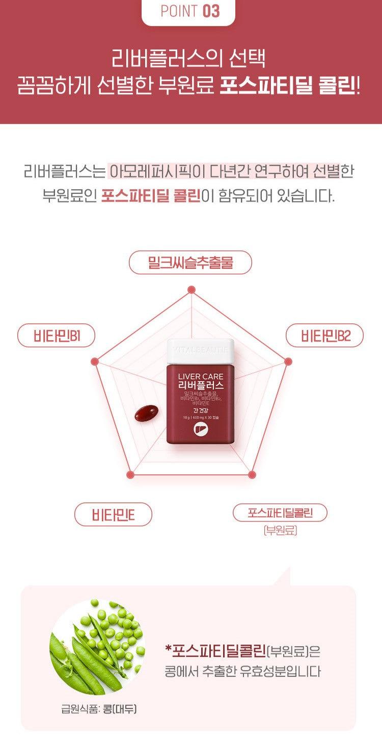 Viên Bổ Gan Vital Beautie Liver Plus có chứa phosphatidylcholine, một thành phần phụ được Amorepacific lựa chọn qua nhiều năm nghiên cứu. Phosphatidylcholine (thành phần phụ) là hoạt chất được chiết xuất từ đậu nành.