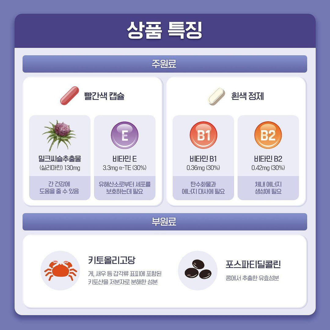 Milk thistle extract powder (from Italy), D-α-tocopherol, vitamin B1 hydrochloride, vitamin B2, chitooligosaccharide powder (from crab (from Vietnam)), soybean oil (from Argentina, the United States, Brazil, etc.), lactose, mixed preparation (hydroxypropyl methylcellulose, isomalt, calcium carbonate, stearic acid), soybean lecithin (notified form), crystalline cellulose, beeswax, soybean lecithin, calcium carboxymethyl cellulose, silicon dioxide, magnesium stearate, gardenia yellow pigment, cocoa pigment *Capsule base - gelatin, glycerin, D-sorbitol solution, annatto pigment Contains soybeans, crab, milk, and pork