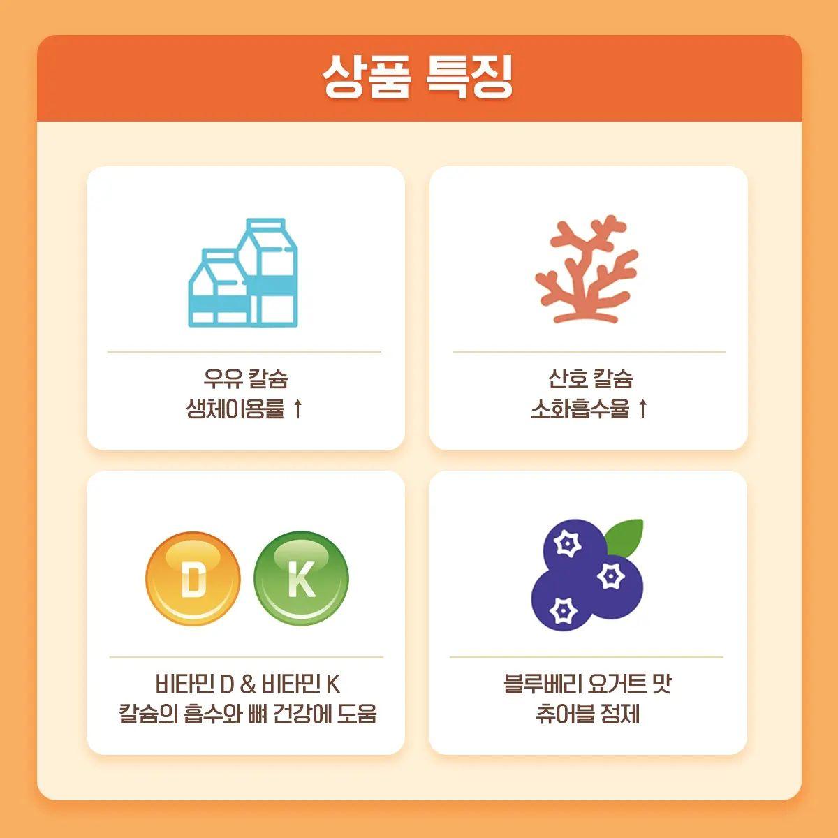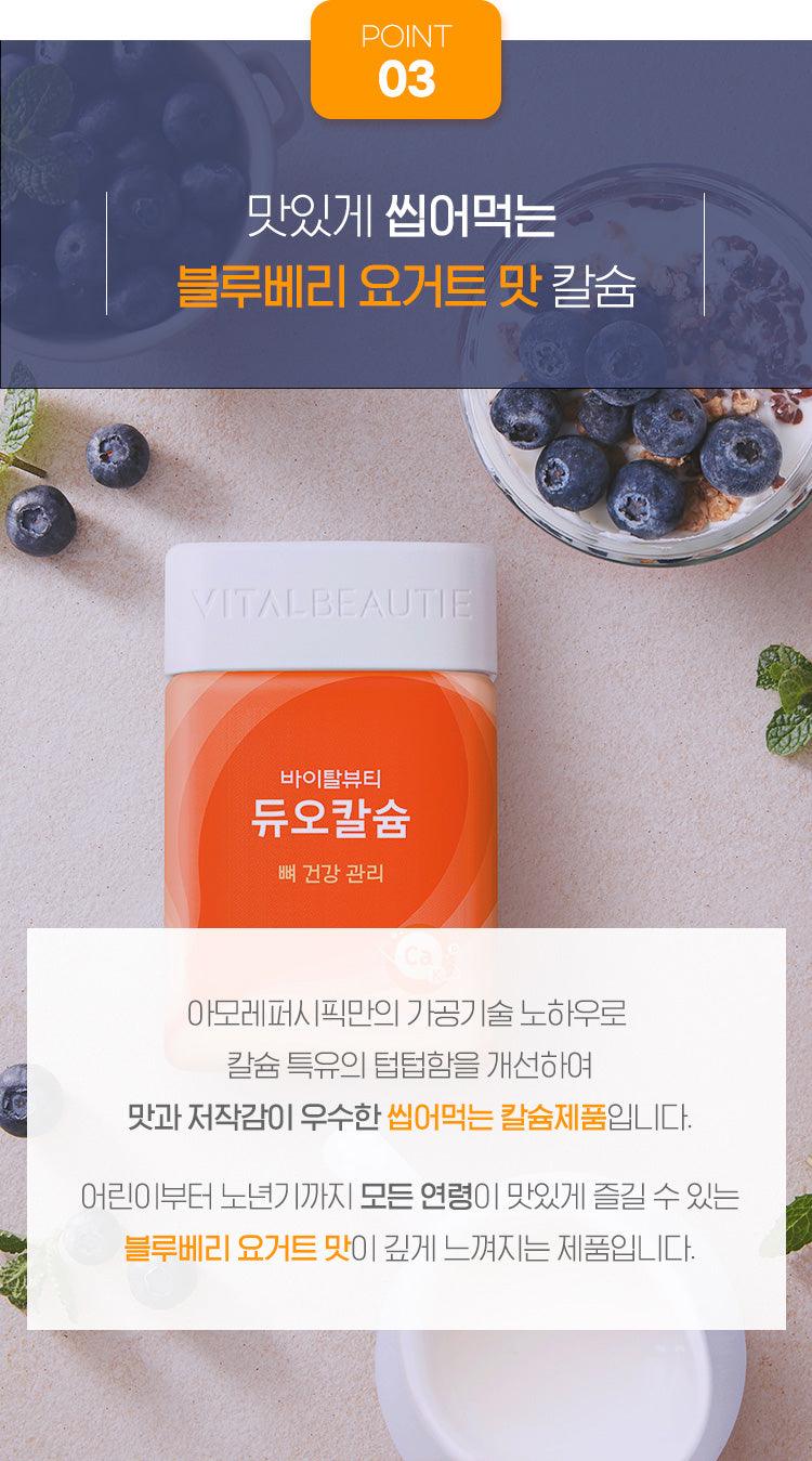 Bí quyết công nghệ chế biến độc đáo của Amorepacific đã cải thiện độ mờ đặc trưng canxi. Viên Nhai Vital Beautie Duo Calcium là một sản phẩm canxi có thể nhai được với hương vị sữa chua việt quất dẻo và cảm giác nhai tuyệt vời. Món ăn ngon cho mọi lứa tuổi, từ trẻ em đến người già.
