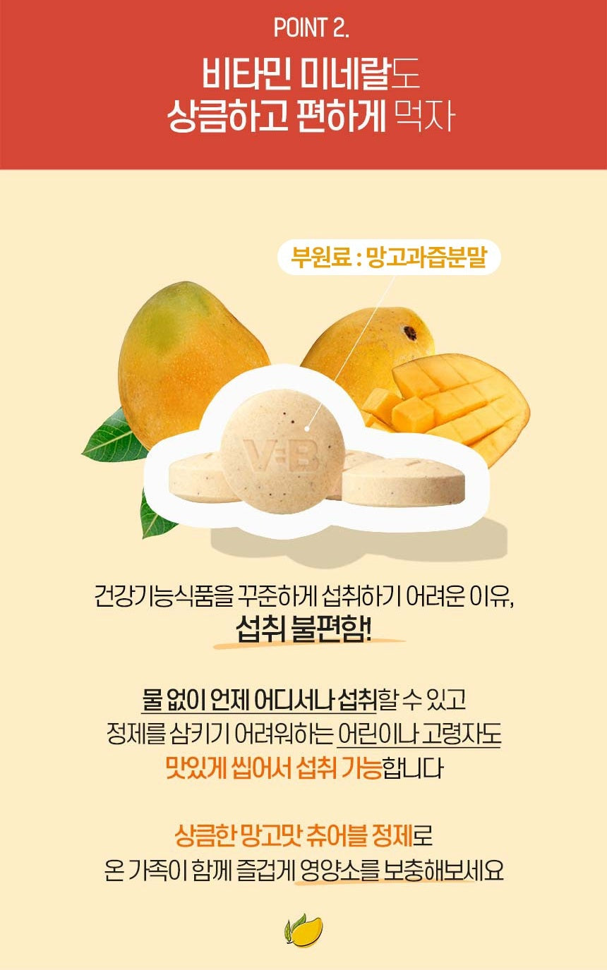 Dạng viên nhai hương xoài giúp việc bổ sung vitamin không còn là gánh nặng, có thể dùng như một bữa ăn nhẹ dinh dưỡng.