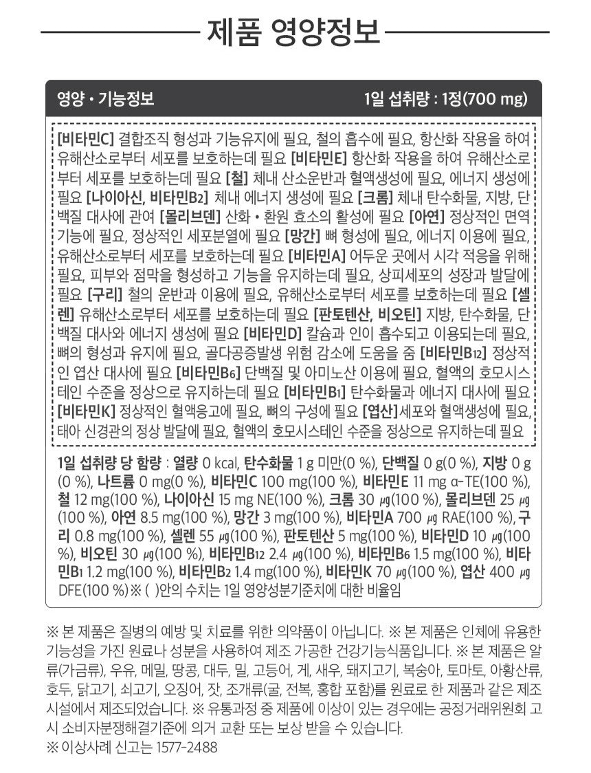 Sản phẩm chứa 20 loại vitamin và khoáng chất được lựa chọn khoa học, bao gồm nhóm vitamin tan trong chất béo, vitamin nhóm B và các khoáng chất vi lượng quan trọng.