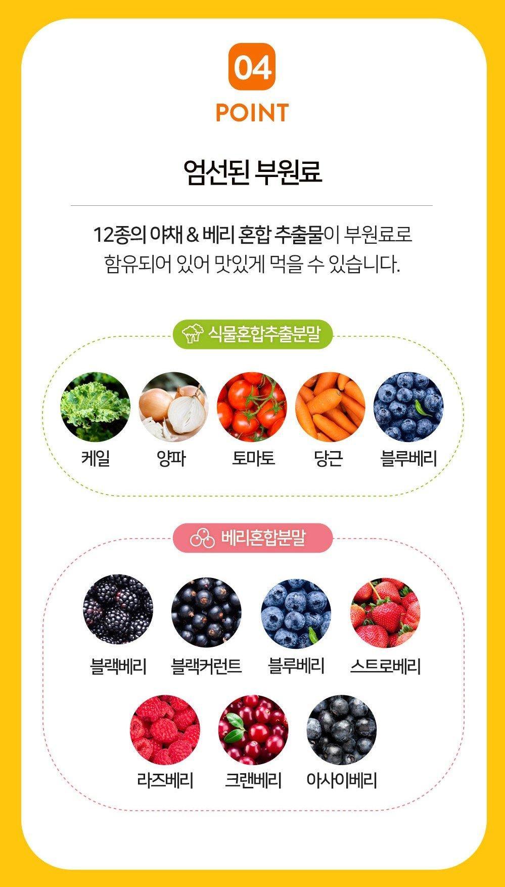 Loại có thể nhai để uống mà không cần nước. Vị cam ưa thích cho trẻ nhỏ gồm 10 loại Vitamin, 13 loại khoáng chất, xuất xứ an toàn, tổng hợp 12 loại rau/ quả mọng.