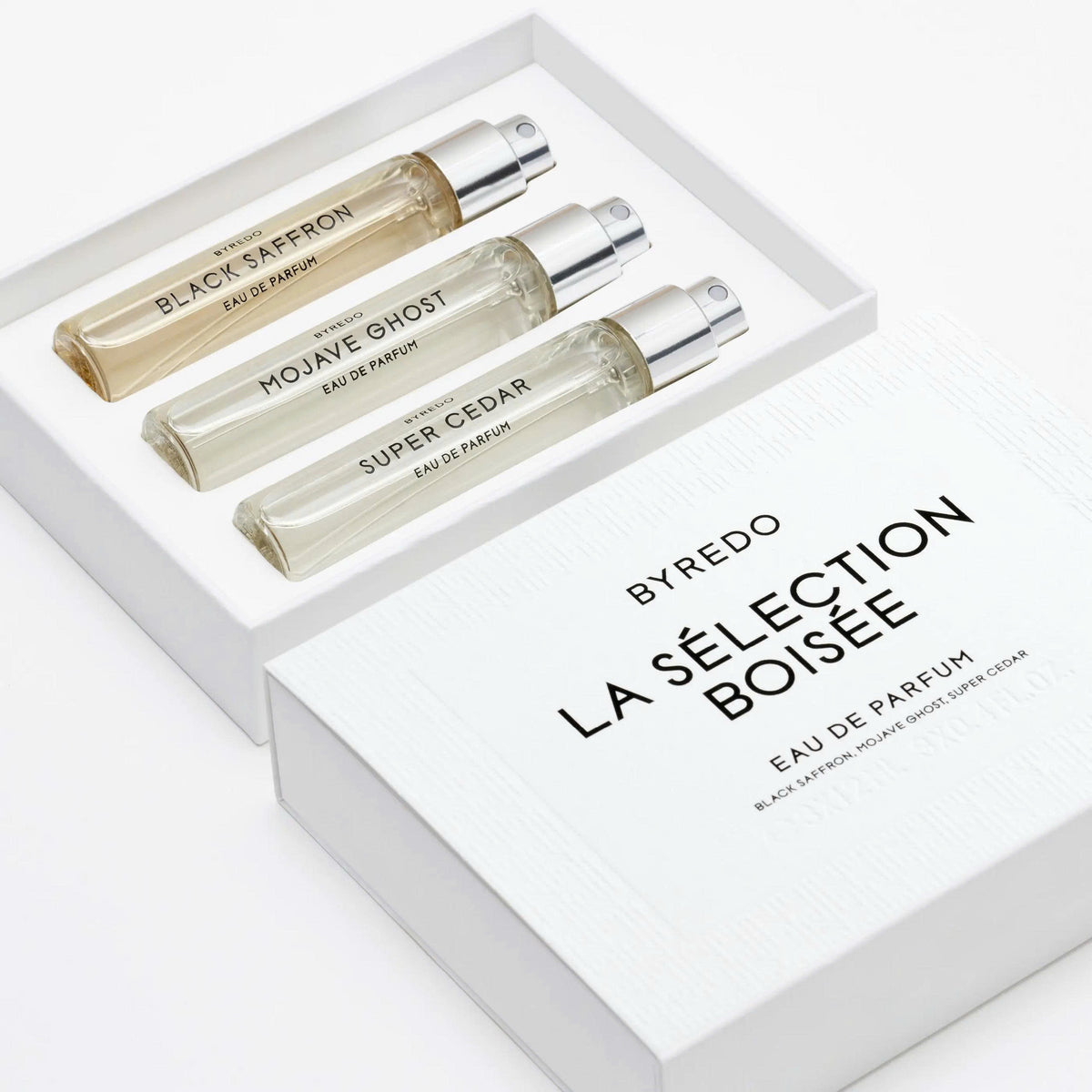 La Sélection Boisée được đựng trong hộp đen tối giản, tinh tế theo phong cách tối giản đặc trưng của BYREDO. Mỗi chai nước hoa dạng xịt dung tích 12ml có thiết kế nhỏ gọn, tinh xảo và sang trọng, thích hợp mang theo trong túi xách, ví cầm tay hoặc hộp đựng da thủ công “Nécessaire de Voyage” của BYREDO.