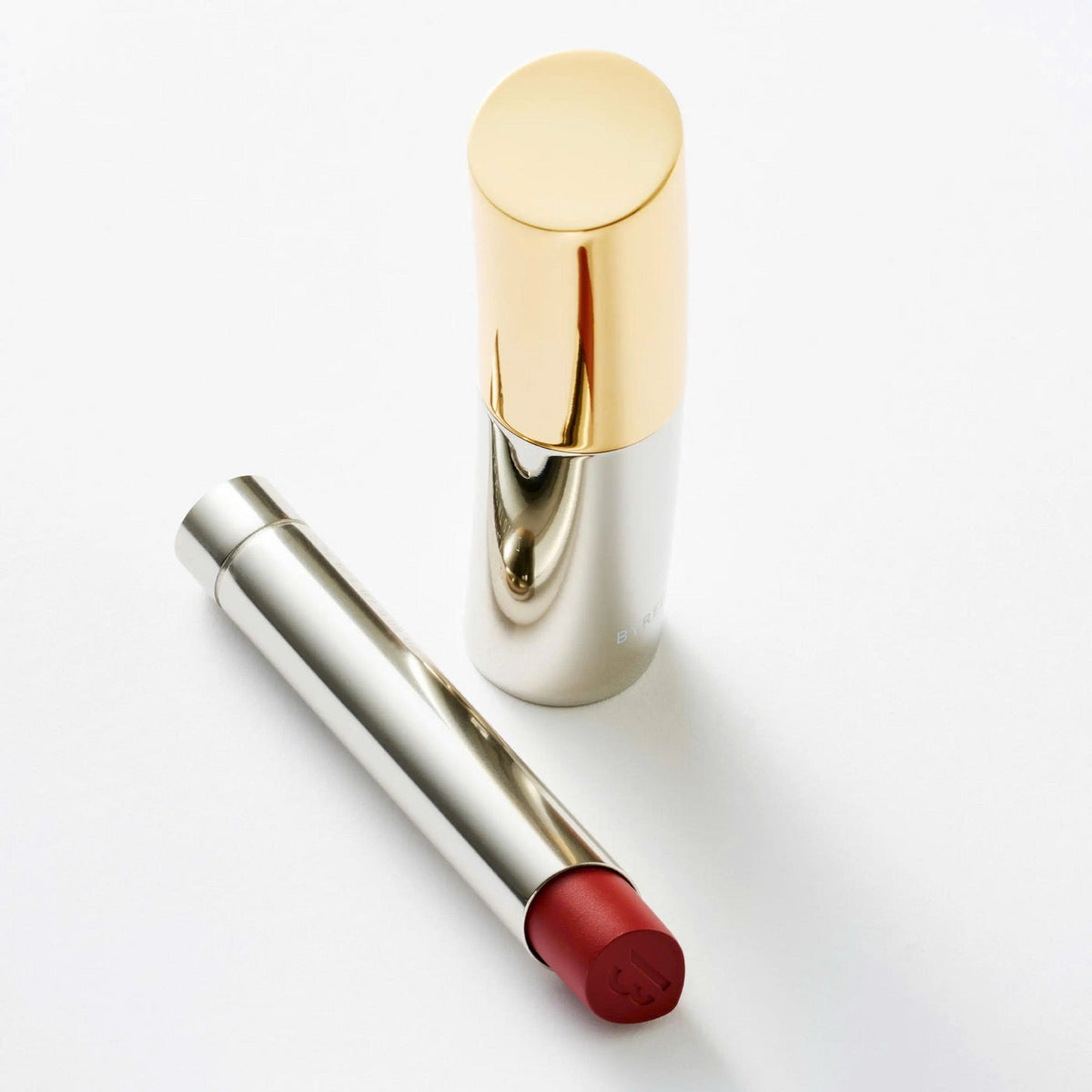 Không thể không nhắc đến thiết kế đặc trưng của dòng BYREDO Satin Lipstick – một thiết kế mang đậm dấu ấn nghệ thuật bởi nhà sáng lập Ben Gorham. Thỏi son mang hình dáng cong mềm mại với chất liệu kim loại mạ ánh bạc hoặc vàng, tạo nên cảm giác như một món trang sức hiện đại. Từng đường cong đều được tính toán để nằm gọn trong lòng bàn tay, tạo cảm giác chắc chắn và sang trọng khi sử dụng.