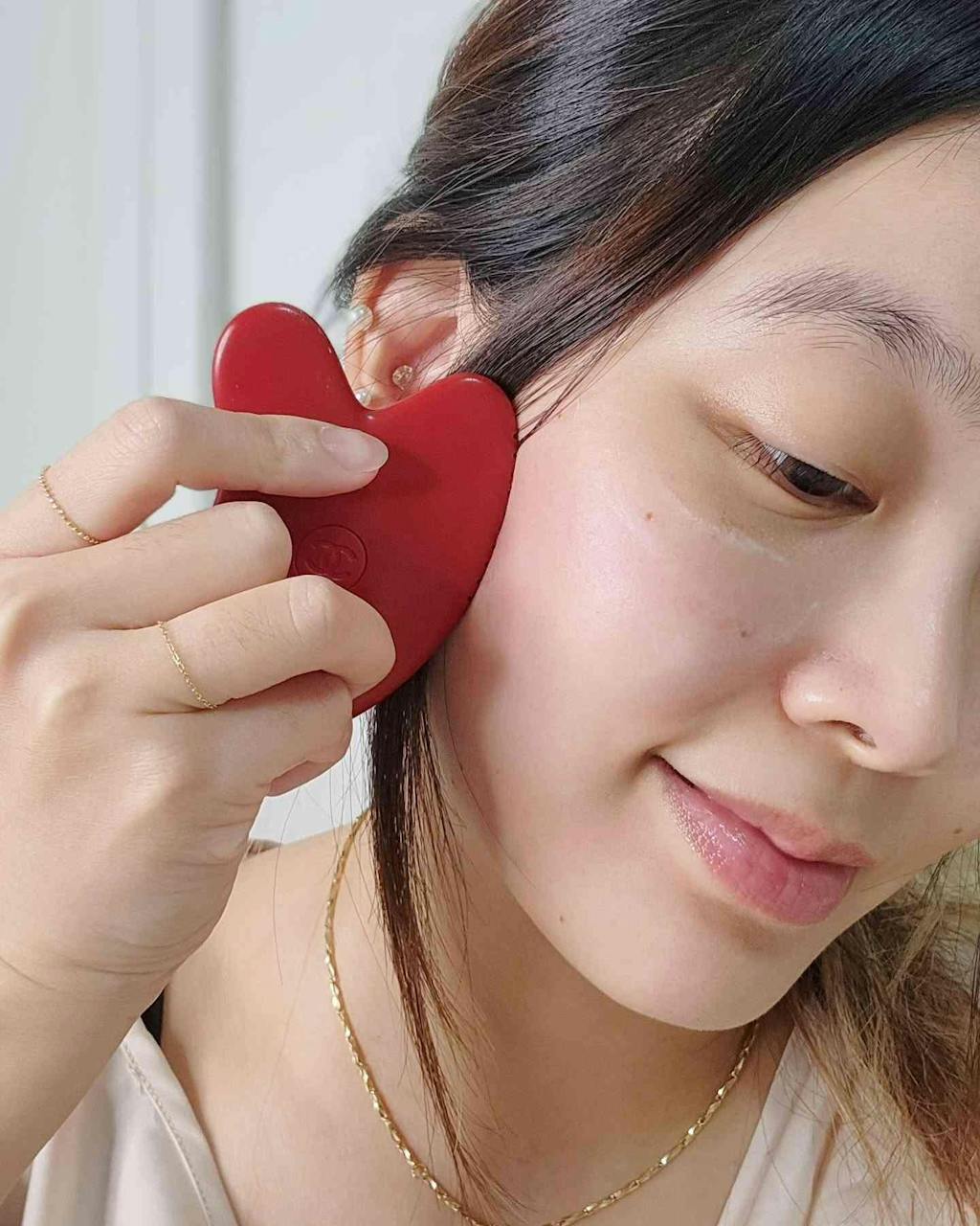- Làm mịn: Kết thúc quy trình bằng cách sử dụng mặt lõm của dụng cụ massage để thực hiện các động tác làm mịn cuối cùng trên khuôn mặt.