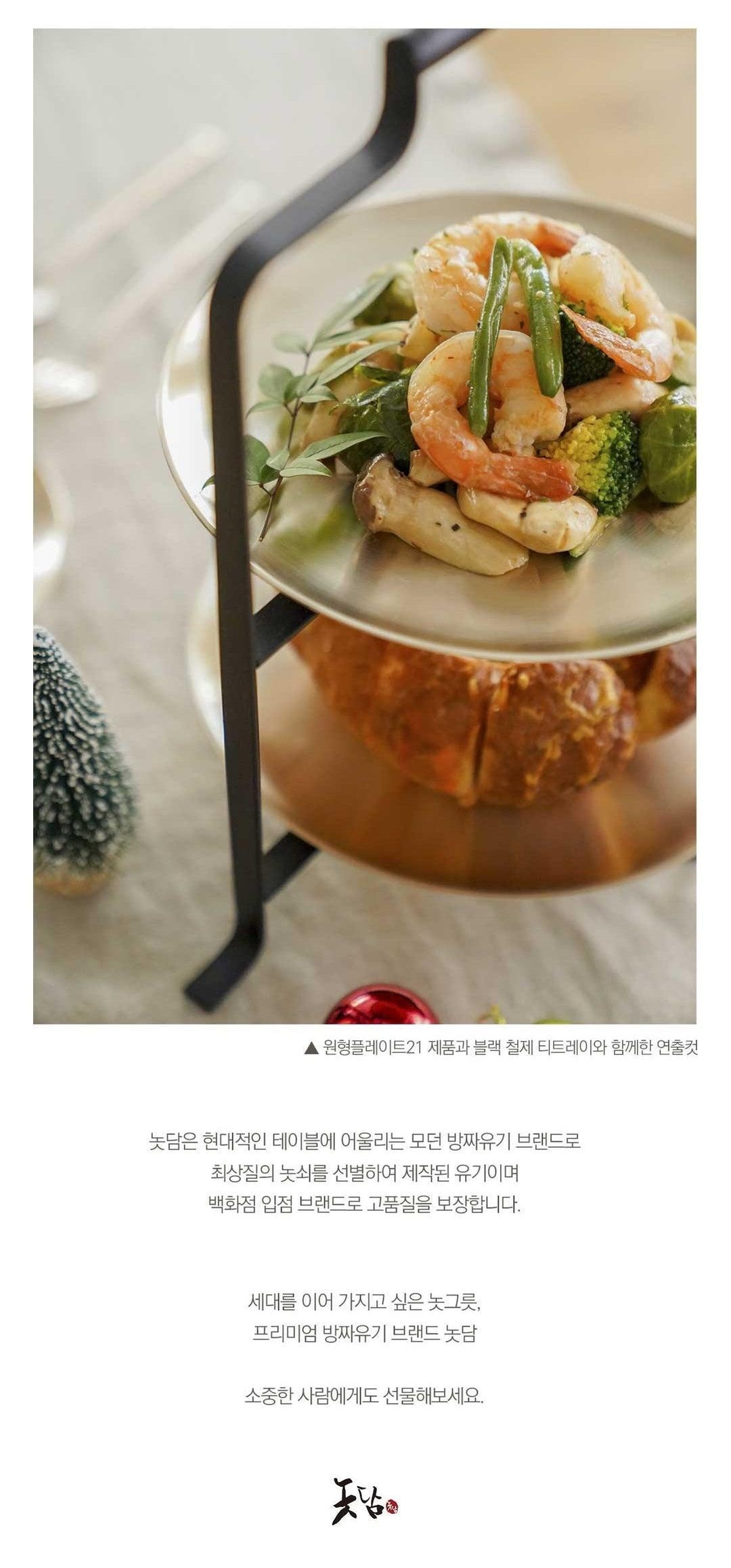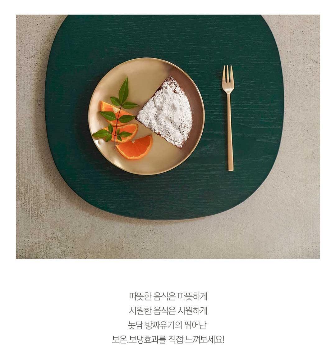 Dĩa tròn nhỏ nhất 16 cm không chỉ dùng làm món ăn kèm mà còn được dùng làm đĩa tráng miệng. Nó có thể được sử dụng mà không phân biệt giữa thực phẩm Hàn Quốc và phương Tây, vì vậy dĩa rất được khuyến khích sử dụng. Đĩa tròn Notdam Bangjja Yugi được làm bằng kỹ thuật rèn nóng bằng cách kết hợp 78% đồng và 22% thiếc.