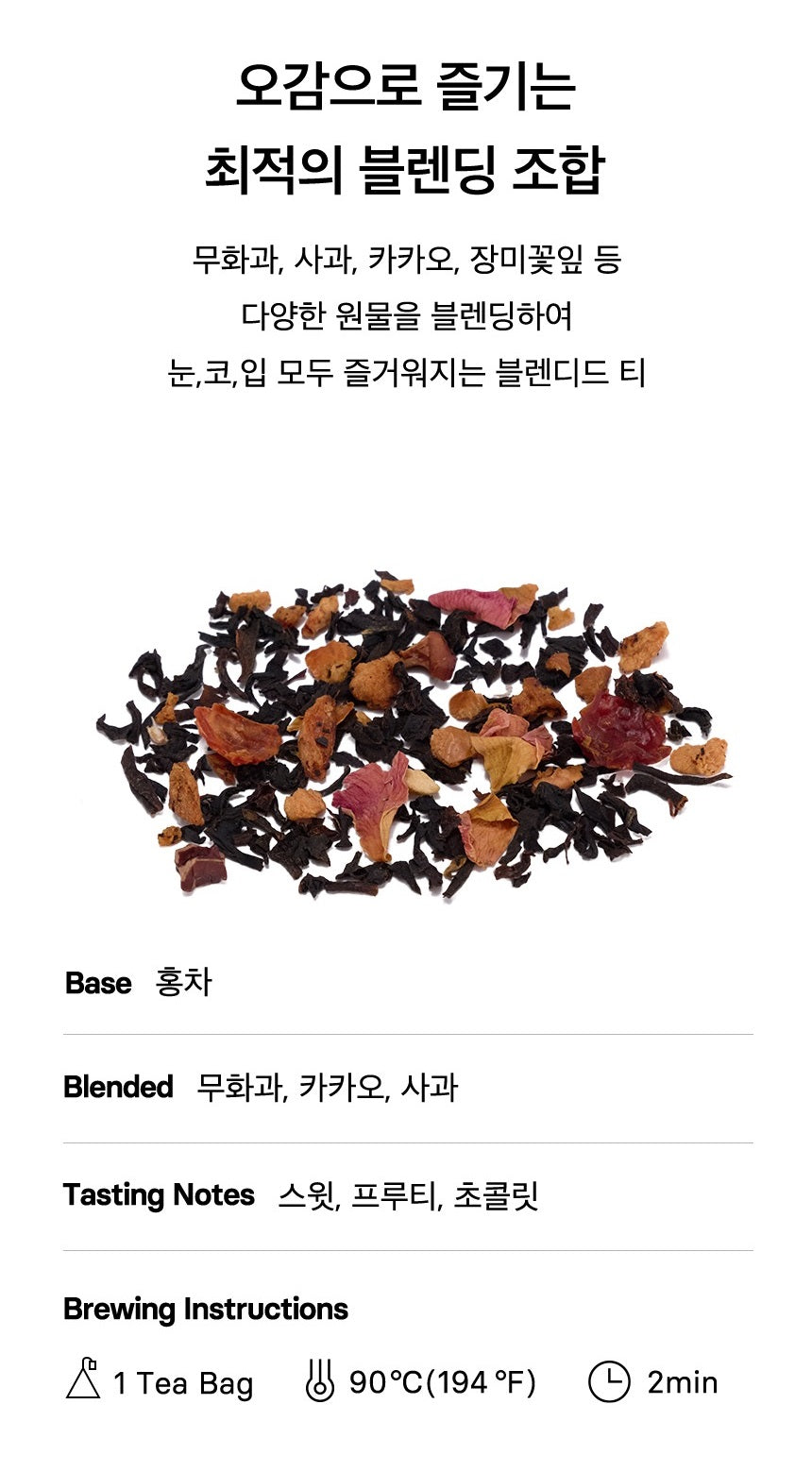 Black tea (Indian 91.7%, Jeju 8.3%), apple dice (Turkish Yesan), cacao nibs (Peru), rose hips, flavoring 1 (fig flavor), flavoring 2 (fig flavor), dried fig dice (fig: domestic), rose petals