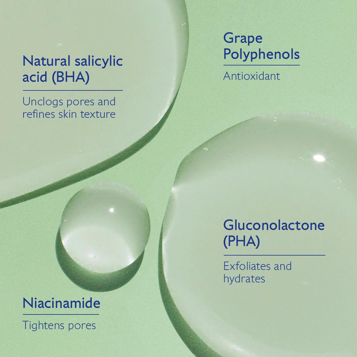 Niacinamide và PHA hỗ trợ thu hẹp lỗ chân lông, đồng thời cải thiện bề mặt da.