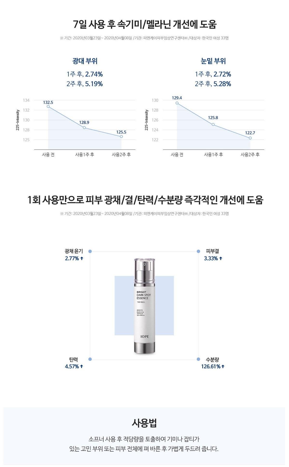 IOPE Bright Dark Spot Essence ứng dụng Melasolv để chăm sóc toàn diện các vùng da bị nám lâu năm cũng như các đốm tăng sắc tố tiềm ẩn dưới da. Theo kết quả nghiên cứu lâm sàng, chỉ sau 7–14 ngày sử dụng, người dùng đã nhận thấy sự cải thiện rõ rệt về màu sắc và độ đậm của vùng da bị nám, đặc biệt là vùng gò má và dưới mắt.