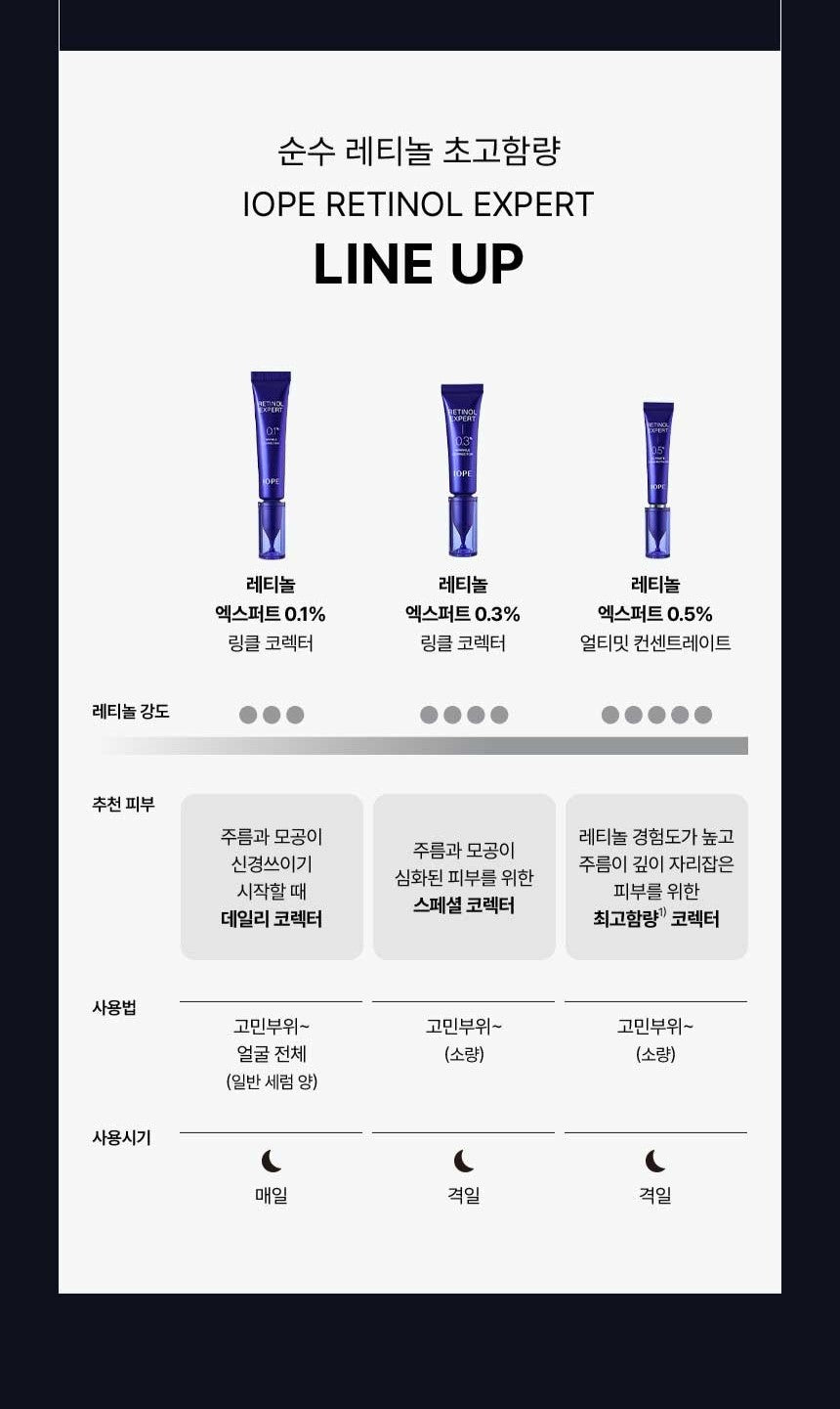 Ngược lại, nếu bạn là người mới bắt đầu, IOPE có các phiên bản nồng độ thấp hơn như 0.1% và 0.3% để tập làm quen.
