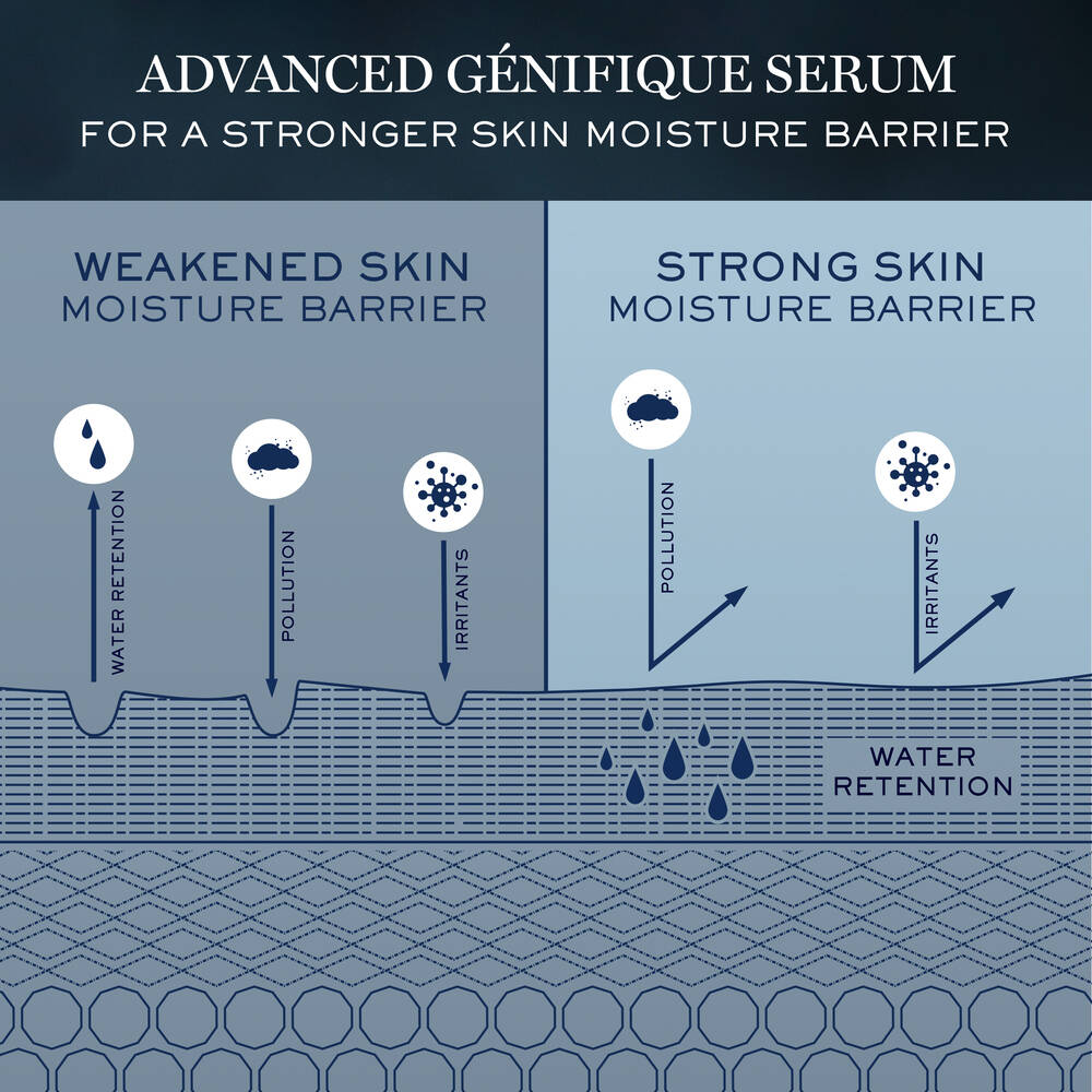 Tinh chất dưỡng da LANCÔME Advanced Génifique Youth Activating Concentrate là sự pha trộn của các thành phần mạnh mẽ, bao gồm Bifidus Prebiotic, Axit Hyaluronic và Vitamin Cg. Các thành phần này hoạt động phối hợp để tăng cường khả năng phòng vệ của da chống lại các tác nhân gây ô nhiễm môi trường như ô nhiễm và điều kiện thời tiết khắc nghiệt. Công thức của huyết thanh được thiết kế để không chỉ tăng cường độ sáng tự nhiên của da mà còn chống lại các dấu hiệu lão hóa bằng cách cải thiện độ đàn hồi của da và giảm sự xuất hiện của nếp nhăn.