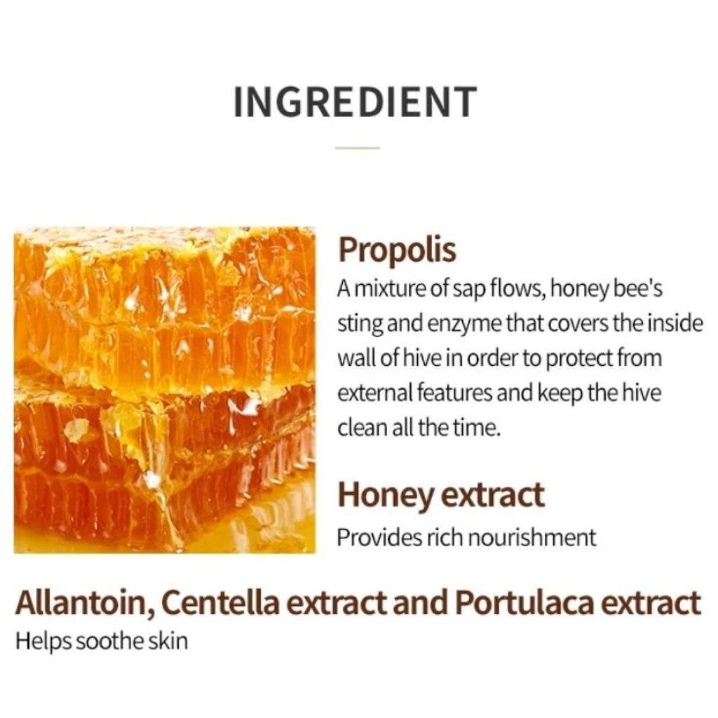Chiết xuất từ keo ong chứa Ceramid tương từ như lipid bảo vệ hàng rào da giúp làm săn chắc và chứa 8 loại amino acids cung cấp độ ẩm cho da và cân bằng lượng dầu cho da.