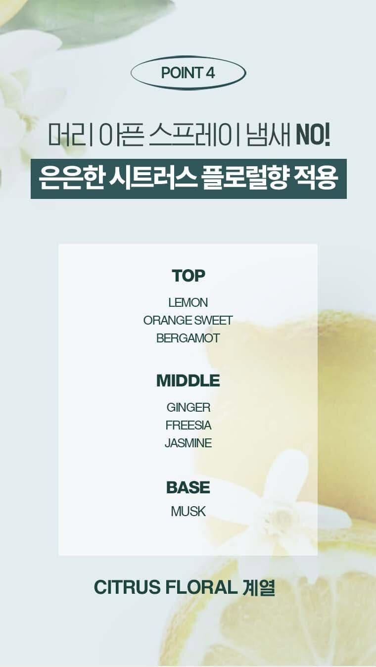 Hương citrus floral gồm sự tươi mát của chanh, cam, bergamot kết hợp cùng gừng, hoa lan dạ hương và nhài, cuối cùng lưu lại chút musk ấm áp. Mùi hương này vừa tạo cảm giác sảng khoái khi xịt, vừa không lấn át mùi nước hoa cá nhân.