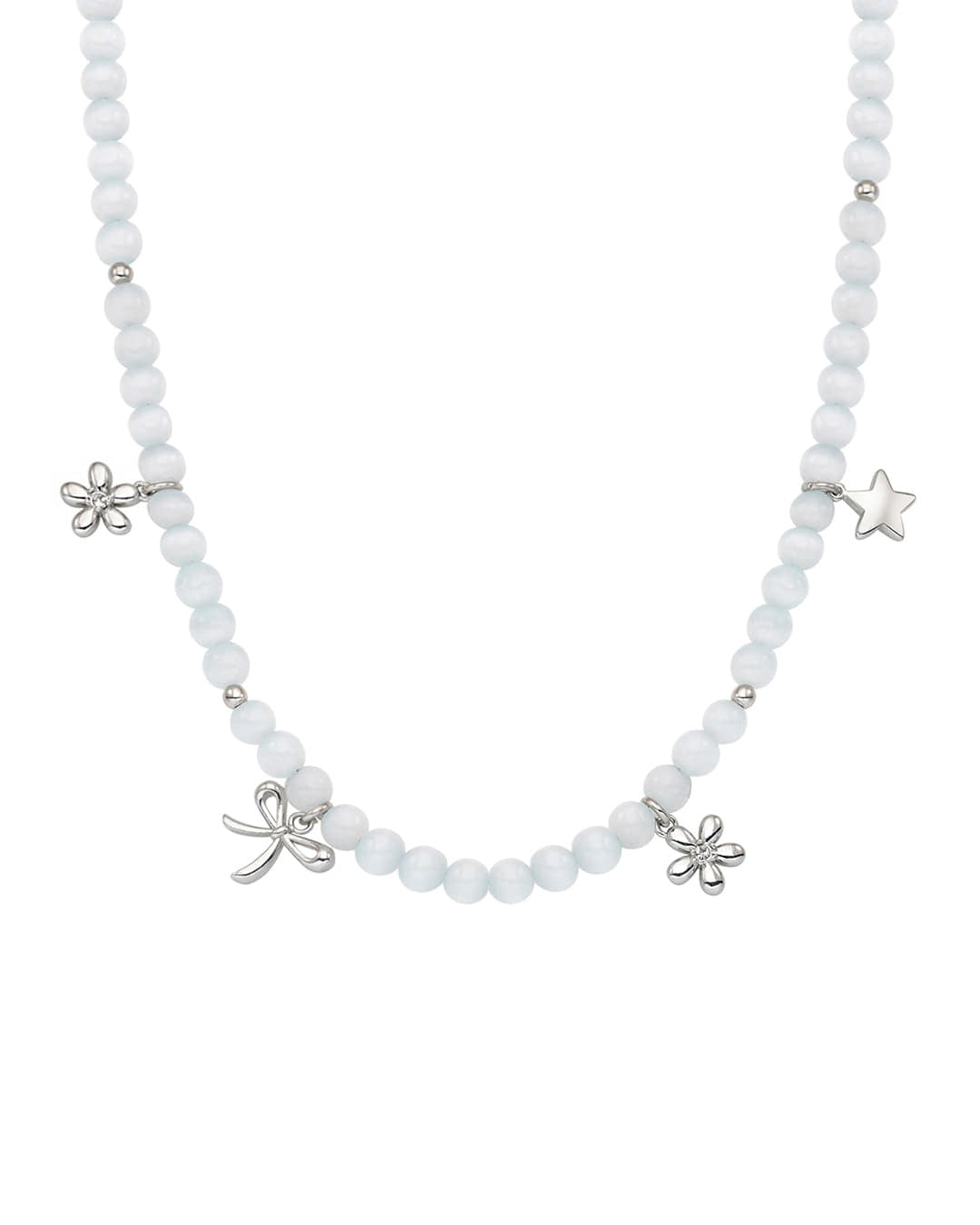 Chiếc vòng cổ này sử dụng đá Cat’s Eye ánh xanh nhạt – tông màu dịu mát tương đồng với Pale Gray nhưng lại tạo nên hiệu ứng ánh sáng bắt mắt, giúp tổng thể outfit không bị nhạt nhòa.