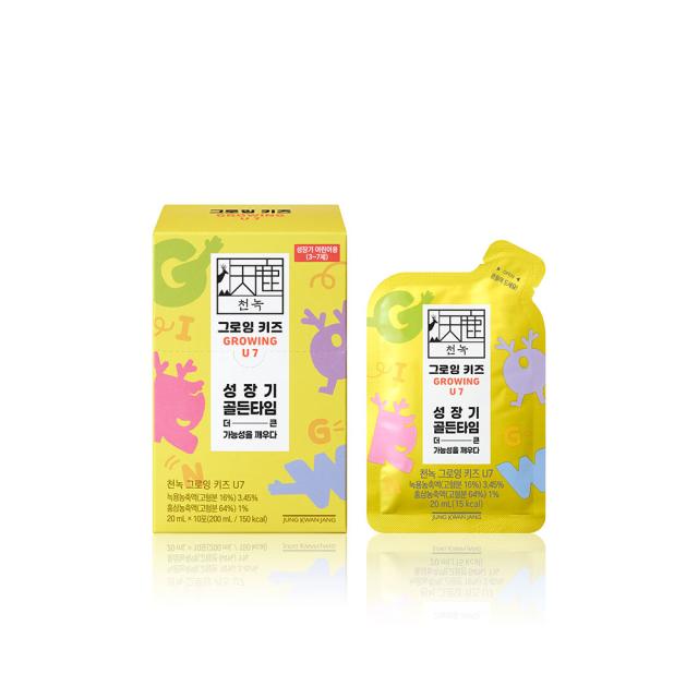 Jung Kwan Jang Cheon Nok Growing Kids U7 (천녹 그로잉 키즈 U7 20ml×20포) là sản phẩm thuộc dòng Cheon Nok (Thiên Lộc) danh tiếng của thương hiệu Jung Kwan Jang (KGC) – nhà sản xuất hồng sâm số 1 Hàn Quốc được nhà nước bảo trợ.