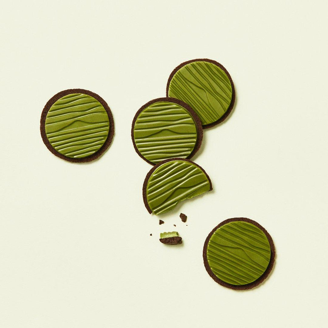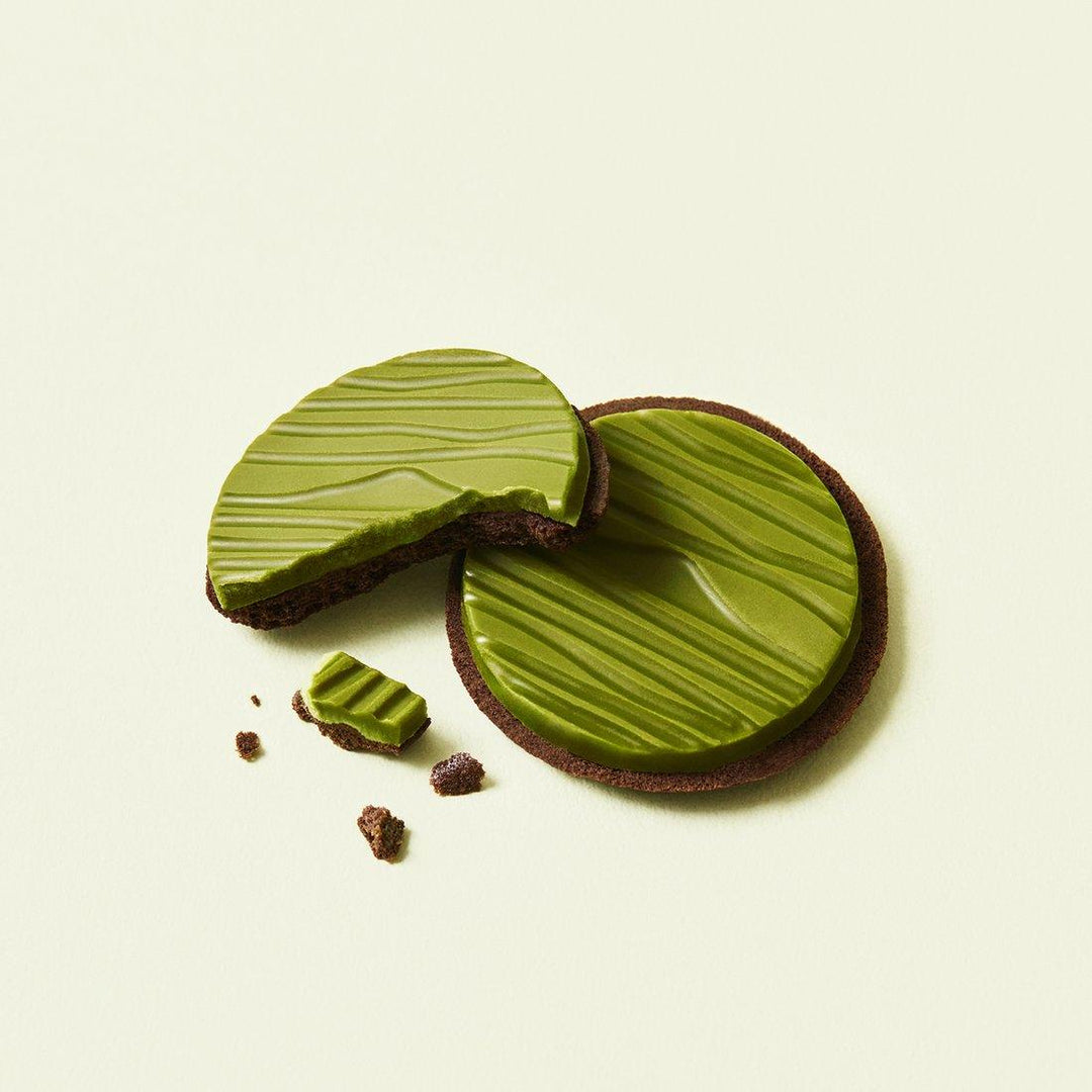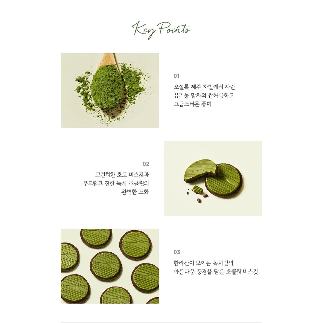 Sự hòa quyện hoàn hảo giữa bánh quy socola giòn tan và socola trà xanh mềm mịn, đậm đà. Bánh Quy Osulloc Signature Biscuits với khung cảnh tuyệt đẹp của cánh đồng trà xanh với tầm nhìn ra Núi Hallasan.