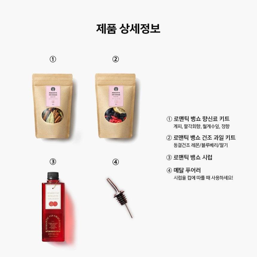 Bộ Siro Pha Chế Starbucks Romantic Vin Chaud Set gồm Bộ gia vị Vin Chaud Quế 50g, thì là hình bát giác, lá nguyệt quế, đinh hương, Bộ Trái cây sấy khô Vin Chaud 25g chanh, việt quất, dâu tây đông khô, Vin Chaud Syrup 500mL và đầu rót kim loại để rót syrup vào ly.