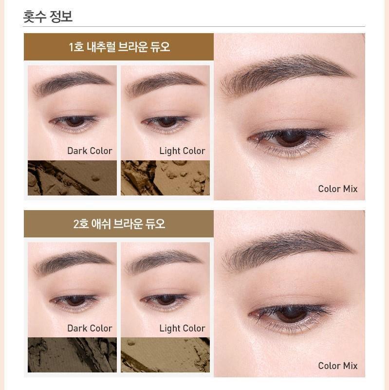 Với hai tông màu tự nhiên, đầu chân mày chúng ta sẽ dùng màu nhạt hơn để tán, với đuôi chân mày chúng ta sẽ dùng màu đậm, tạo một đôi chân mày tự nhiên hoàn hảo.