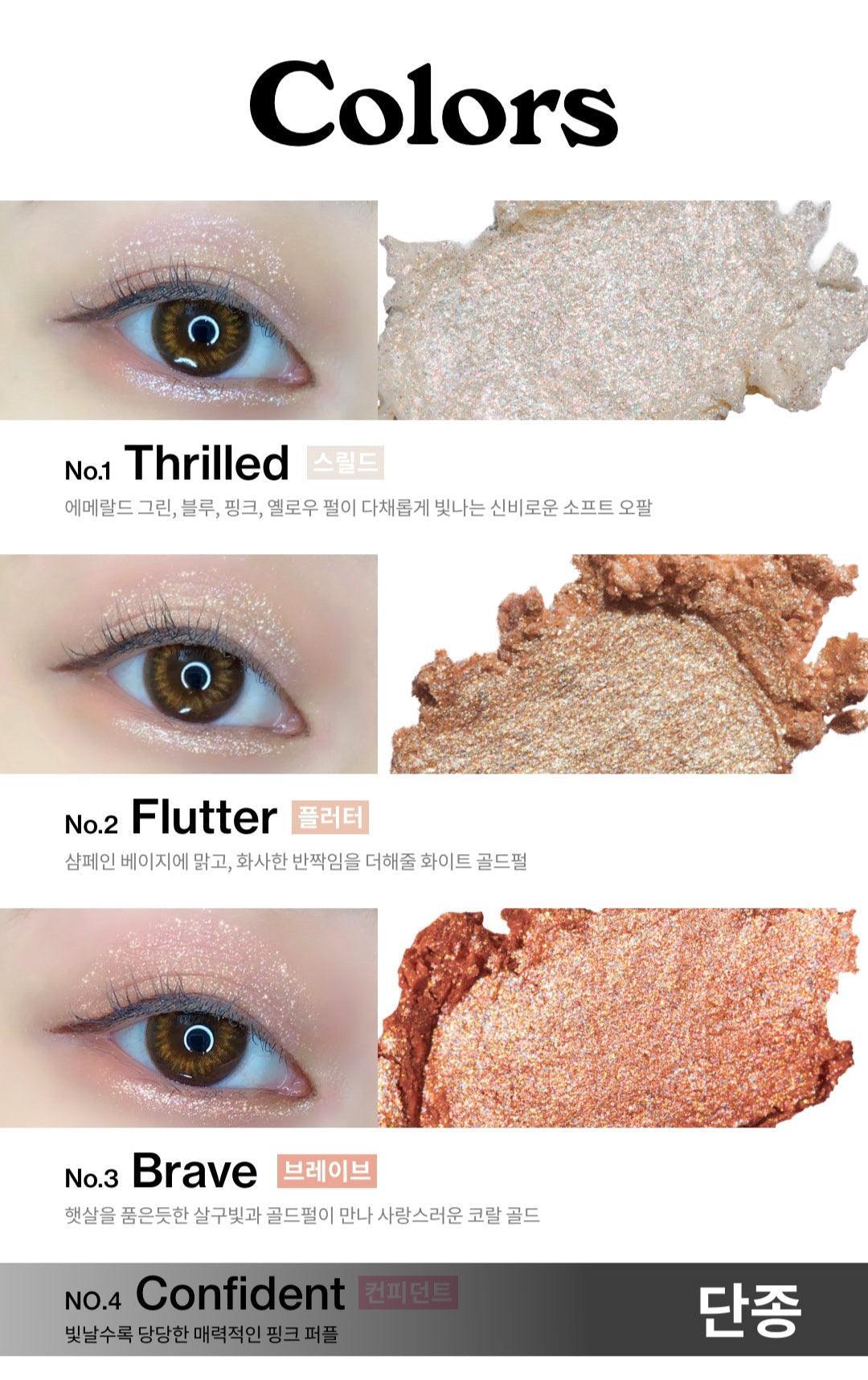 [No.1. [Thrilled Stealed] Stearate, red iron oxide, disteadimonium hectorite, tin oxide, synthetic fluorophlogopite, dimethicone, propylene carbonate, tocopheryl acetate, ascorbic acid, butylene glycol, purified water, aloe vera leaf extract. [No.2 Flutter Flutter] Trimethylsiloxysilicate, methyltrimethicone, calcium aluminum borosilicate, octyldodecanol, isohexadecane, synthetic wax, microcrystalline wax, ceresin, silica, titanium diox. Trimethylsiloxysilicate, methyl trimethicone, calcium aluminum borosilicate, octyldodecanol, isohexadecane, synthetic wax, microcrystalline wax, calcium sodium borosilicate, titanium dioxide, ceresin, dibutyllauroyl gel. Rutamide, isododecane, dibutyl ethylhexanoyl glutamide, polyglyceryl-2 triisostearate, silica, diastea dimonium hectorite, tin oxide, propylene carbonate, dimethicone, tocopheryl acetate, Ascorbic acid, butylene glycol, purified water, aloe vera leaf extract [No.4 Confident Confidence] Side, Calcium Sodium Borosilicate, Dibutylauroyl Glutamide, Isododecane, Calcium Titanium Borosilicate, Dibutyl Ethylhexanoyl Glutamide, Polyglyceryl-2 Tria Iso [No.3 Brave] Trimethylsiloxysilicate, methyltrimethicone, octyldodecanol, calcium aluminum borosilicate, isohexadecane, microcrystalline wax, synthetic wax, calcium sodium borosilicate, titanium dioxide, Ceresin, dibutyllauroylglutamide, isododecane, mica, dibutylethylhexanoylglutamide, polyglyceryl-2 triisostearate, silica, Red iron oxide, disteadimonium hectorite, tin oxide, propylene carbonate, dimethicone, ascorbic acid, tocopheryl acetate, butylene glycol, purified water, aloe vera leaf extract. Side, disteadimonium hectorite, mica, dimethicone, propylene carbonate, red No. 202, hydrogenated polyisobutene, yellow No. 5, phenoxyethanol, palmitic acid, benzoic acid. [No.5 Dusk Dusk] Trimethylsiloxysilicate, methyl trimethicone, octyldodecanol, calcium aluminum borosilicate, isohexadecane, calcium sodium borosilicate, microcrystalline wax, polyethylene, titanium dioxide, ceresin, dibutylauro Monoglutamide, isododecane, silica, dibutyl ethylhexanoyl glutamide, polyglyceryl-2 triisostearate, tinoce