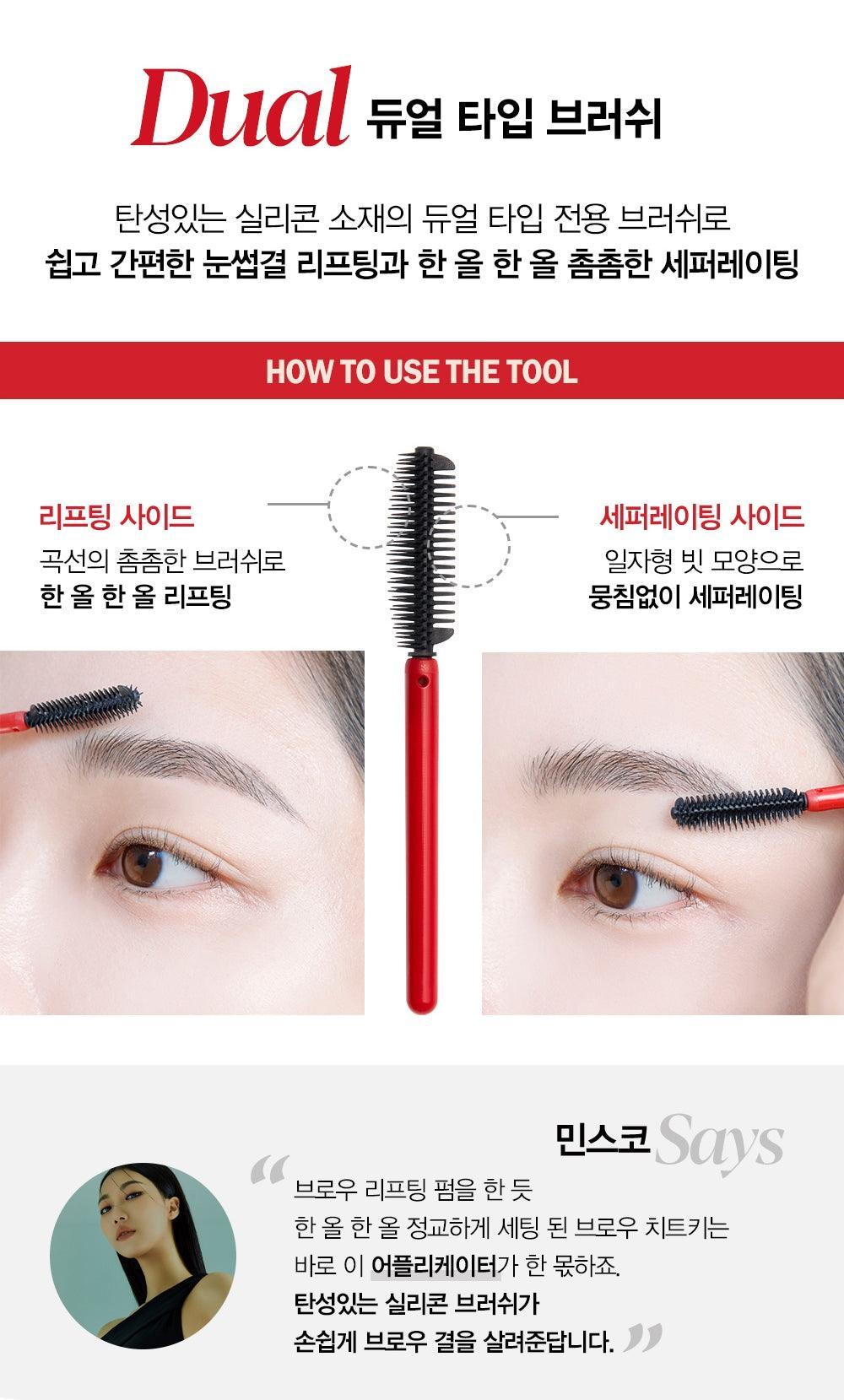 Một loại cọ kép làm bằng chất liệu silicone đàn hồi giúp nâng mày dễ dàng và thuận tiện và tách từng sợi lông mày một cách tinh tế.