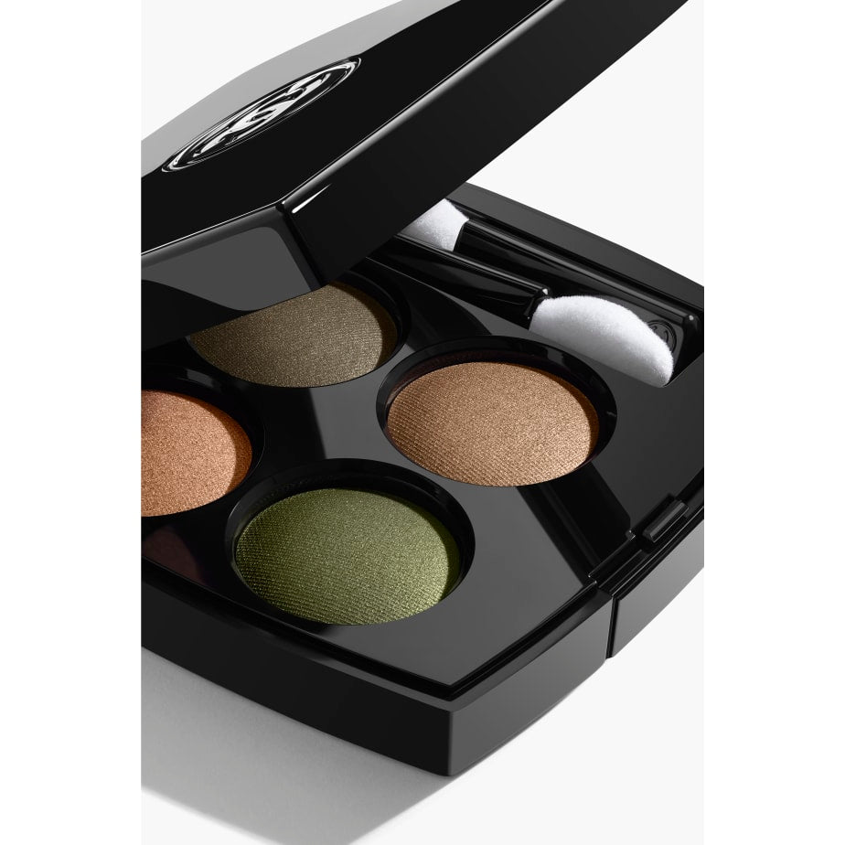 Thiết kế của bảng màu phấn mắt CHANEL Les 4 Ombres Multi-Effect Quadra Eyeshadow #318 Blurry Green - Pinkish Bronze, Dark Green, Golden Satin Green, Greyish Antique Gold thể hiện nét thẩm mỹ mang tính biểu tượng của CHANEL—kiểu dáng đẹp, tinh tế và vượt thời gian. Hộp đựng di động sơn mài màu đen, hoàn chỉnh với gương, vừa có chức năng vừa phong cách, khiến nó trở thành người bạn đồng hành hoàn hảo cho cả việc trang điểm hàng ngày và khi đi du lịch.