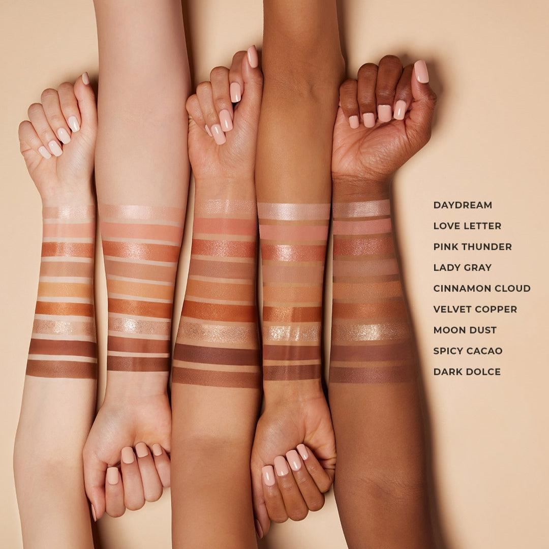 Bảng màu ổn định, được lựa chọn cẩn thận bao gồm các lớp nền mịn như nhung, lớp nền bóng mượt và ánh kim loại mềm mại. Công thức ướt và khô dễ dàng pha trộn và xây dựng để tạo ra vẻ ngoài tùy chỉnh từ sang trọng tự nhiên đến quyến rũ dễ dàng.