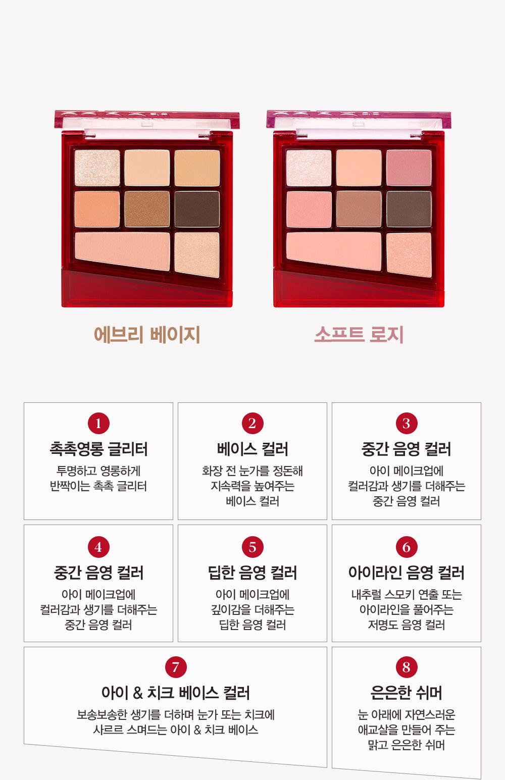Phân lớp rõ ràng mà ngay cả những người mới bắt đầu trang điểm cũng có thể dễ dàng hoàn thành với sự kết hợp màu sắc nhẹ nhàng theo tông màu của màu cơ bản - màu bóng trung bình - màu bóng sâu.