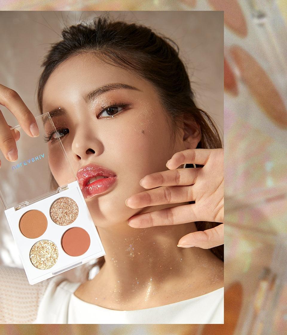 Một bảng phấn mắt với 4 sắc thái với 3 kết cấu độc đáo: một ánh lấp lánh rực rỡ, hai mờ kem, một bóng ngọc trai lung linh. Long lanh có các hạt Chunky để mang lại hiệu ứng tác động cao trong một lần vuốt nhanh.