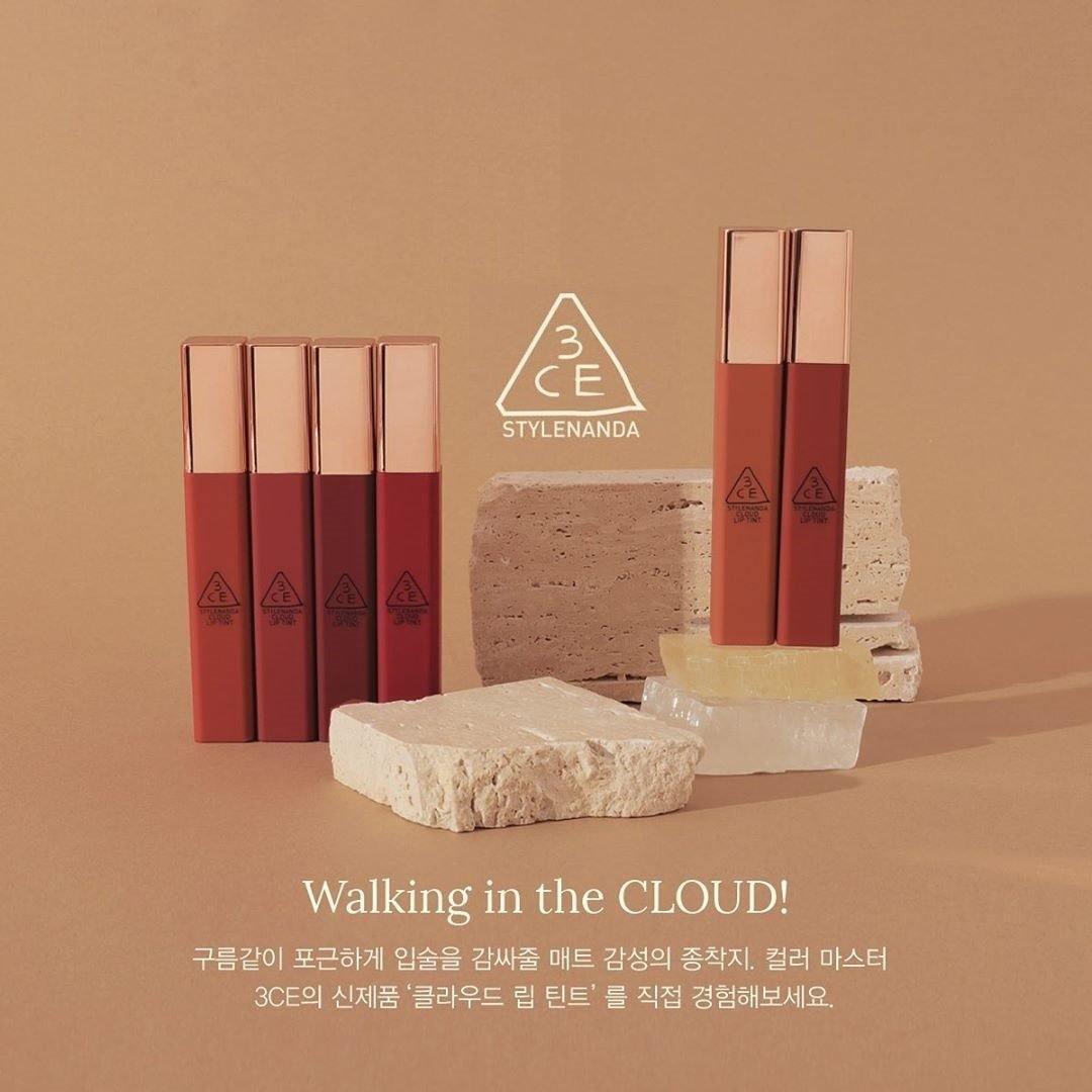 Son 3CE Cloud Lip Tint gồm 12 màu son đất, cam san hô, nude, phù hợp với mọi phong cách dù là nhẹ nhàng hay quyến rũ cùng chất son mềm mịn, độ bám màu lì.