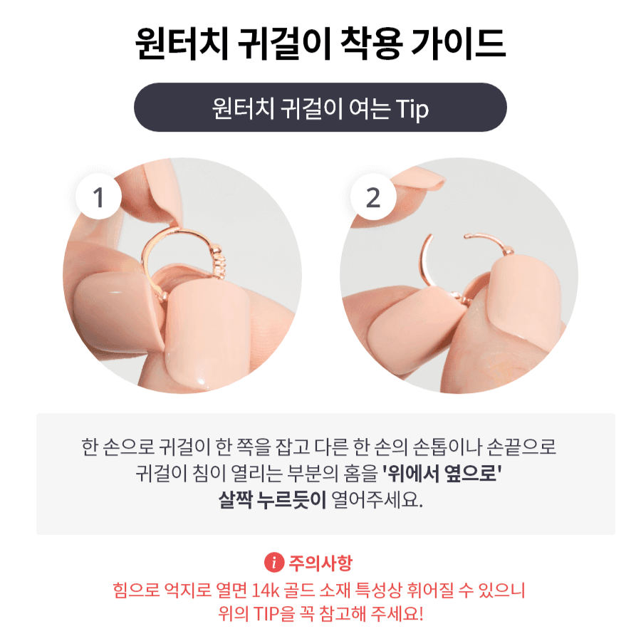Cách sử dụng: Giữ một bên bông tai bằng một tay và dùng móng tay hoặc đầu ngón tay của tay kia để mở rãnh nơi kim bông tai mở ra, như thể nhấn 'từ trên xuống dưới'. Biện pháp phòng ngừa: Nếu bạn mạnh tay mở nó ra, nó có thể bị cong do bản chất của chất liệu vàng 14k, vì vậy hãy tham khảo mẹo trên nhé!