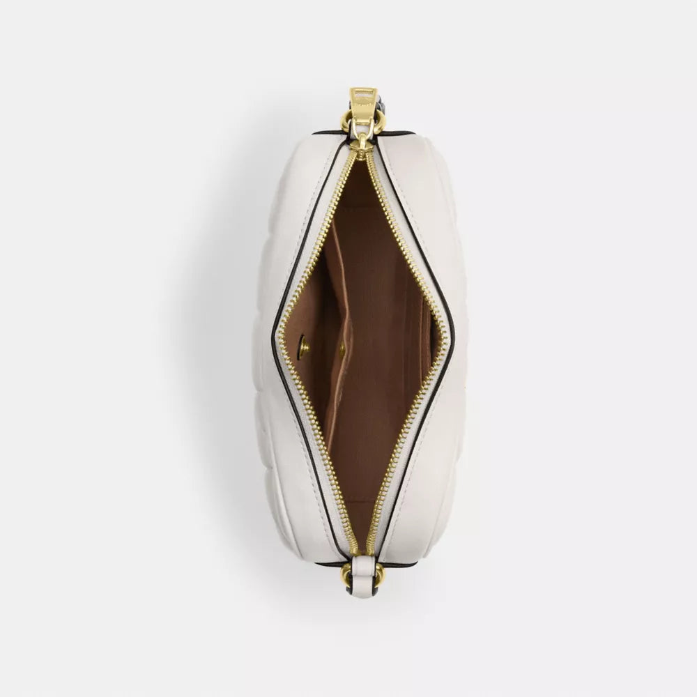 The COACH Mini Jamie Camera Bag with Quilting #Gold / Chalk stands out for its elegant quilted design and sophisticated color combination of Gold and Chalk. The quilting adds texture and depth to the smooth Nappa leather, elevating the overall look while maintaining a clean, minimalist style. The Gold exudes a sense of luxury and, paired with the soft Chalk tone, creates an understated elegance that is ideal for both daytime and evening wear.