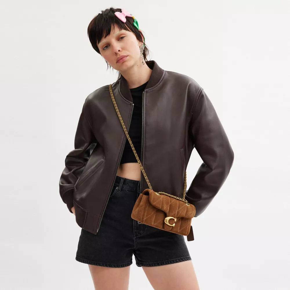 The first thing that strikes you when you see the COACH Tabby Shoulder Bag 20 with Quilting #Brass / Cedar is its luxurious, high-quality material. The bag is crafted from a combination of suede and smooth leather, giving it a sophisticated yet soft texture. The gentle matte finish of the suede beautifully contrasts with the sleek, polished leather, giving the bag a feel that is both opulent and approachable.