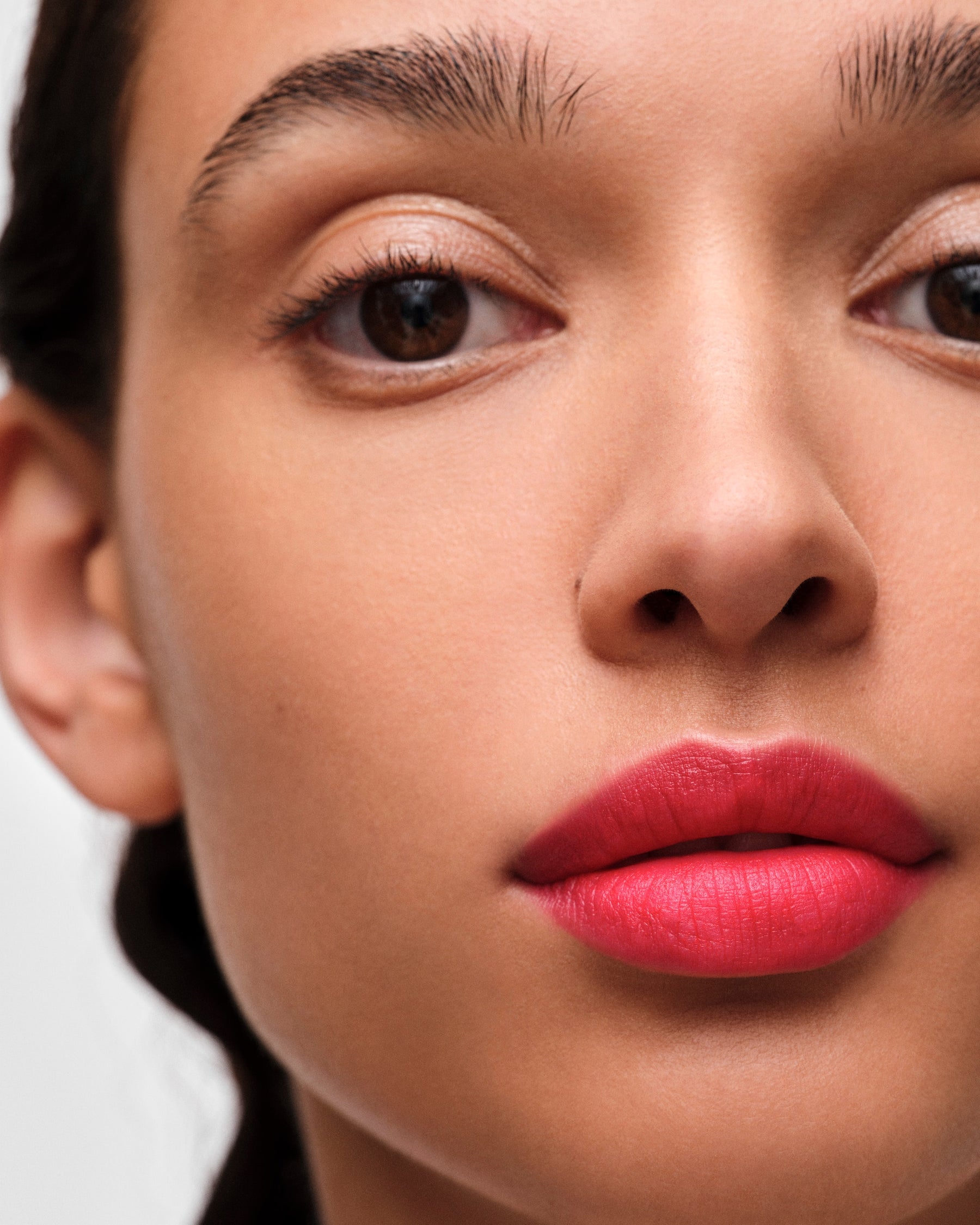 The PRADA Monochrome Soft Matte Lipstick line is composed of a white base and three pure pigments. This combination is designed to recreate the luminosity of Prada's Re-Nylon fabric, resulting in a radiant yet understated matte finish. The outcome is a lipstick that delivers a subtle, diffused color without the typical dryness associated with matte formulations.