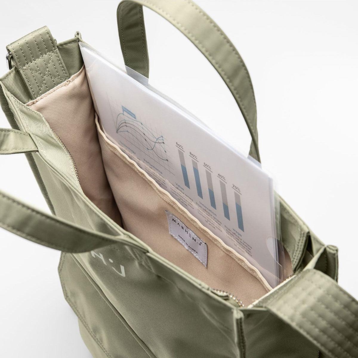 It can hold laptops and A4-sized documents. There's a dedicated cup holder, allowing for convenient storage of your cup. Made from eco-friendly recycled nylon, it offers consistent dye color, practicality, and excellent waterproofing.