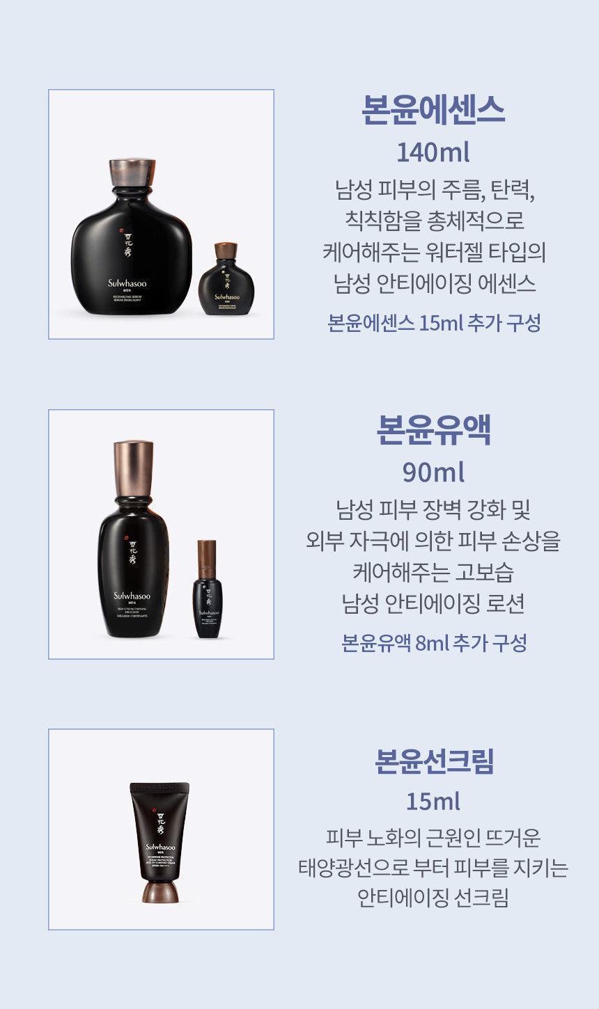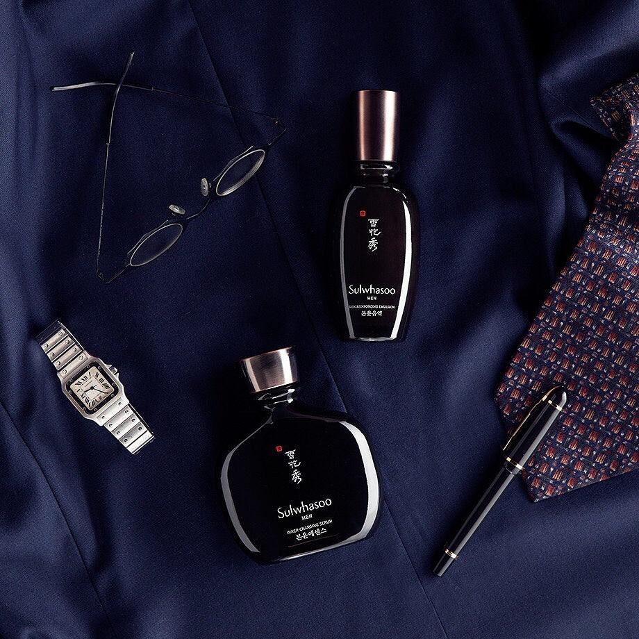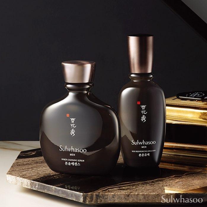 Bộ sản phẩm gồm: Sulwhasoo Men Recharging Serum 140 mL + 15 mL, Men Skin Strengthening Emulsion 90 mL + 8 mL, Men UV Defense Protector 15 mL.
