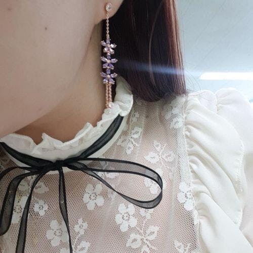 Để làm cho chiều dài nổi bật hơn, họa tiết hoa oải hương làm từ đá tổng hợp thạch anh tím với màu sắc sang trọng, sống động là tâm điểm, thu hút sự chú ý. Kiểu dáng hai dây không cân đối sành điệu thả xuống phía dưới tạo độ dài thích hợp giúp gương mặt càng thêm tỏa sáng.