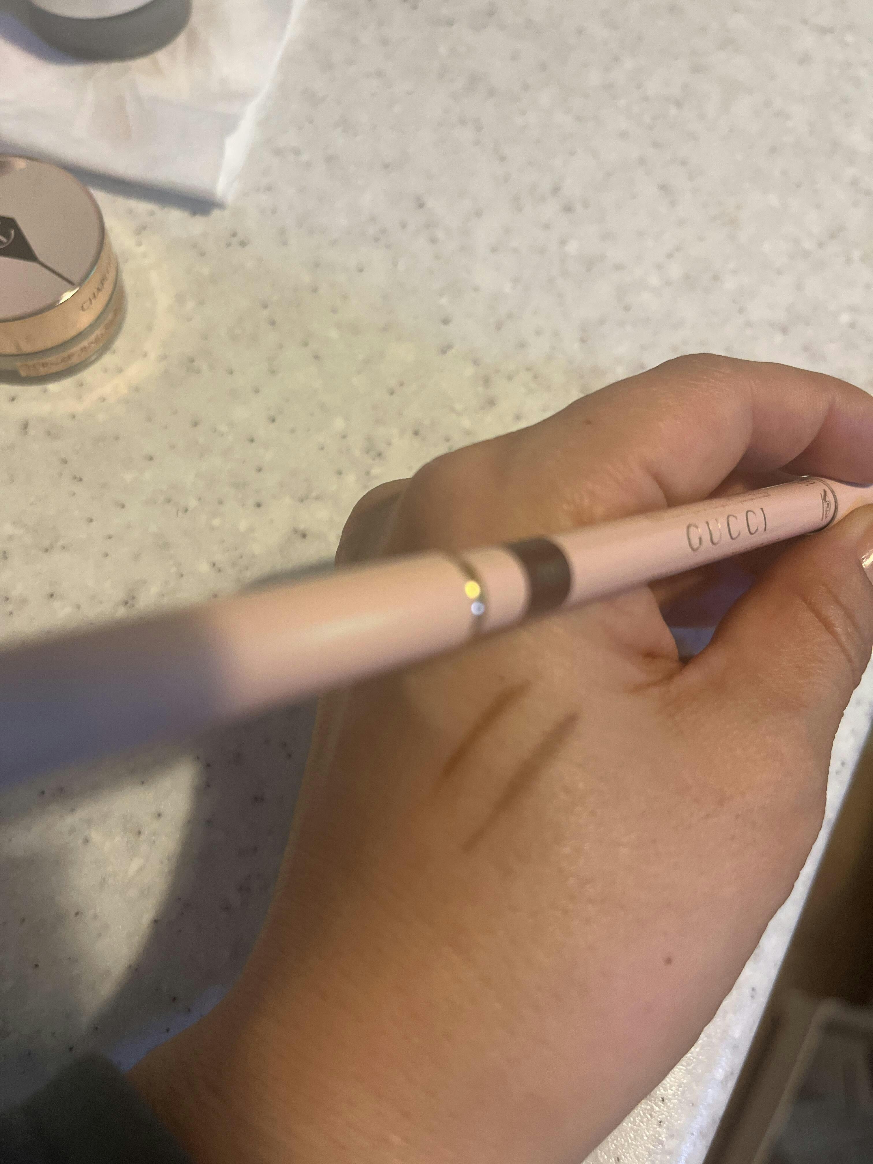 Chì kẻ lông mày GUCCI Crayon Définition Sourcils Eyebrow Pencil có sáu màu, từ vàng đến đen. Tôi có màu 3 Châtain (Nâu nhạt), màu này rất phù hợp với mái tóc nâu trung bình của tôi. Màu sắc không quá ấm hoặc quá lạnh, hòa quyện hoàn hảo với lông mày tự nhiên của tôi. Sản phẩm được đặt trong vỏ màu hồng nhạt viền vàng, có logo Gucci tông vàng. Nó trông rất thanh lịch và sang trọng, và có cảm giác cứng cáp và sang trọng.