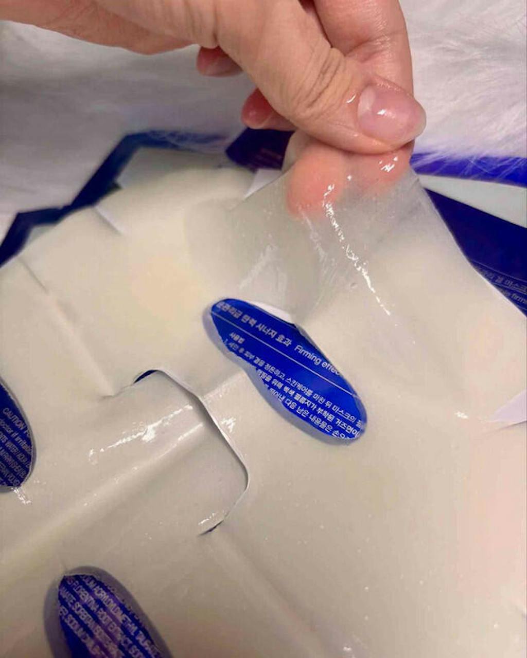 Gỡ mặt nạ, áp phần gạc trắng (bên ngoài có lớp film) vào mặt. Nhẹ nhàng điều chỉnh để mặt nạ bám đều trên toàn bộ khuôn mặt.
