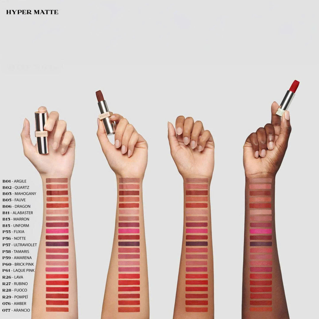 Mỗi sắc son trong dòng Monochrome Hyper Matte đều được xây dựng từ nền màu đen kết hợp ba sắc tố nguyên chất. Công thức này giúp tái hiện chiều sâu màu sắc tương tự như chất liệu da Saffiano – biểu tượng của Prada.