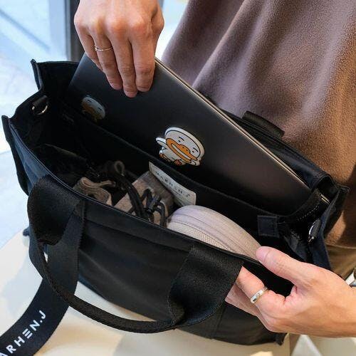 Nhựa Nylon tái chế thân thiện với môi trường, độ đồng đều màu tuyệt vời cũng như tính thực tế và khả năng chống thấm nước. Máy tính xách tay, tài liệu, hồ sơ A4 có thể chứa dễ dàng. Không gian lưu trữ thuận tiện dễ tách tầng với túi đựng cốc chuyên dụng.